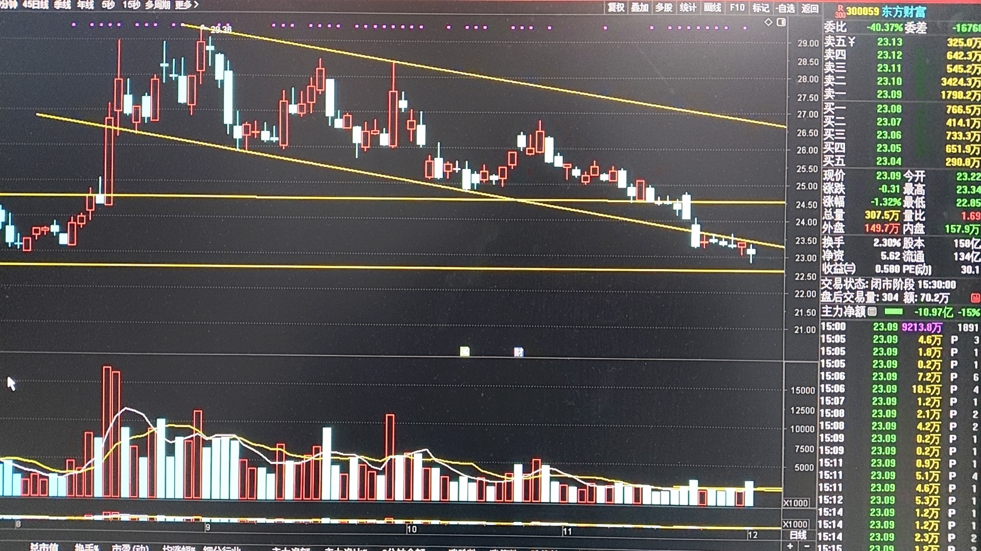 东财日K也再次收出高量柱的阴螺旋桨K线形态,但凡出现高量都有主力参与的痕迹,今天与11月21日的光脚阴区别在于今日出现破低后的v返,多头是有抵抗的!同时macd绿柱依旧缩短,空方动能逐渐消失殆尽!