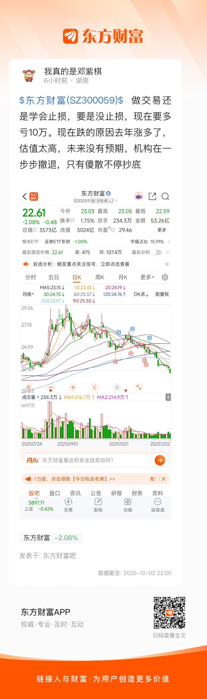 $东方财富(SZ300059)$ 做交易还是学会止损,要是没止损,现在要多亏10万。现在跌的原因去年涨多了,估值太高,未来没有预期,机构在一步步撤退,只有傻散不停抄底