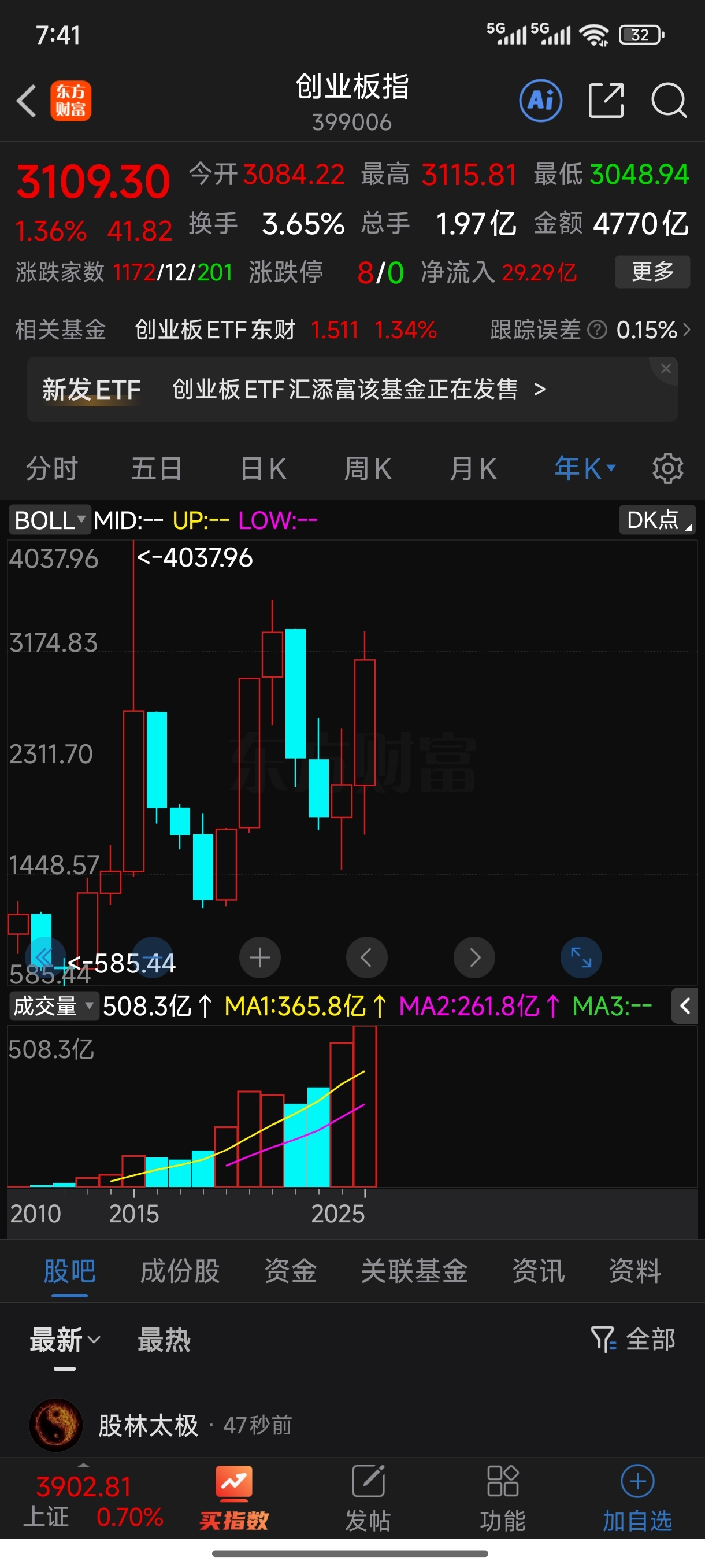 2015创业板指数4037.96东财102.84元,15年的这个好政策连续涨停东