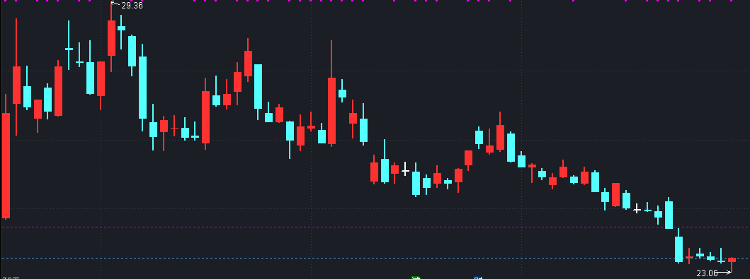 1. 月线未跌破前期波段低点(4月7日18.12元),整体未脱离长期高位震荡区间,并非日线视角下的“无支撑下跌”;