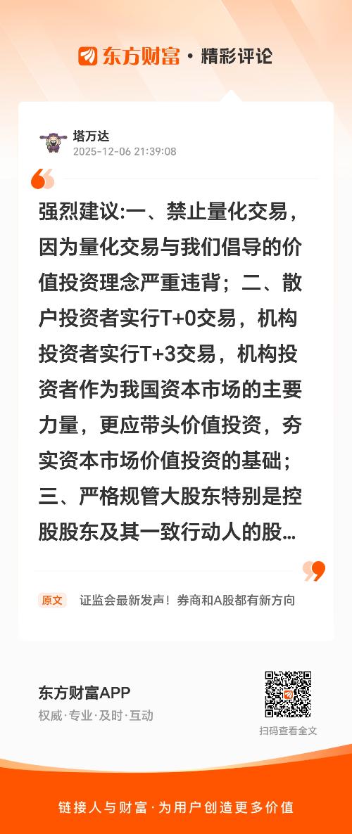 强烈建议:一、禁止量化交易,因为量化交易与我们倡导的价值投资理念严重违背;二、散户投资者实行T+0交易,机构投资者实行T+3交易,机构投资者作为我国资本市场的主要力量,更应带头价值投资,夯实资本市场价值投资的基础;三、严格规管大股东特别是控股股东及其一致行动人的股份减持,实行分红及为公司创造出相应的价值才允许减持股份,否则不能减持;四、上市公司、第三方机构违法行为,特别是控股股东及公司管理人员,从目前的罚款金额大幅提高一百佔,提高上市公司及第三方机构相关人员的刑罚上限,即大幅提高刑期,真正做到处罚到“顷家荡产,牢底坐穿”。 我在《证监会最新发声!券商和A股都有新方向》的评论获得了大家的关注。