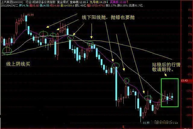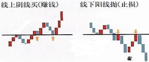 什么叫线上阴线买,就是在股价向下回探工作线的时候肯定是下跌的阴线,这时你要做的就是在工作线附近下单买,而不用去追涨,一旦买错了可以线下阳线卖,就是一旦跌破工作线他会反抽工作线,那时肯定是阳线,这时你不要贪心直接下单卖出就是了。口诀:线上阴线买,买错也要买,线下阳线卖,,卖错也要卖。注意很多个股是沿着工作线慢慢上涨的,并不是剧烈的下跌拉升的。还要注意,如果下周继续创出新高,还是建议大家逐步的减仓战略,大跌不要慌,大涨要小心。殷保华介绍说,所谓“线上阴线买”,要满足两个要求,即股票有效突破均线,在其后几个交易日里,股价就将出现回抽,从而形成一条阴线,但只要没有放量,就可以大胆买入,阴线位置越是靠近均线,买入价越是好。懂得了“线上阴线买”,也就自然懂得了“线下阳线抛”。