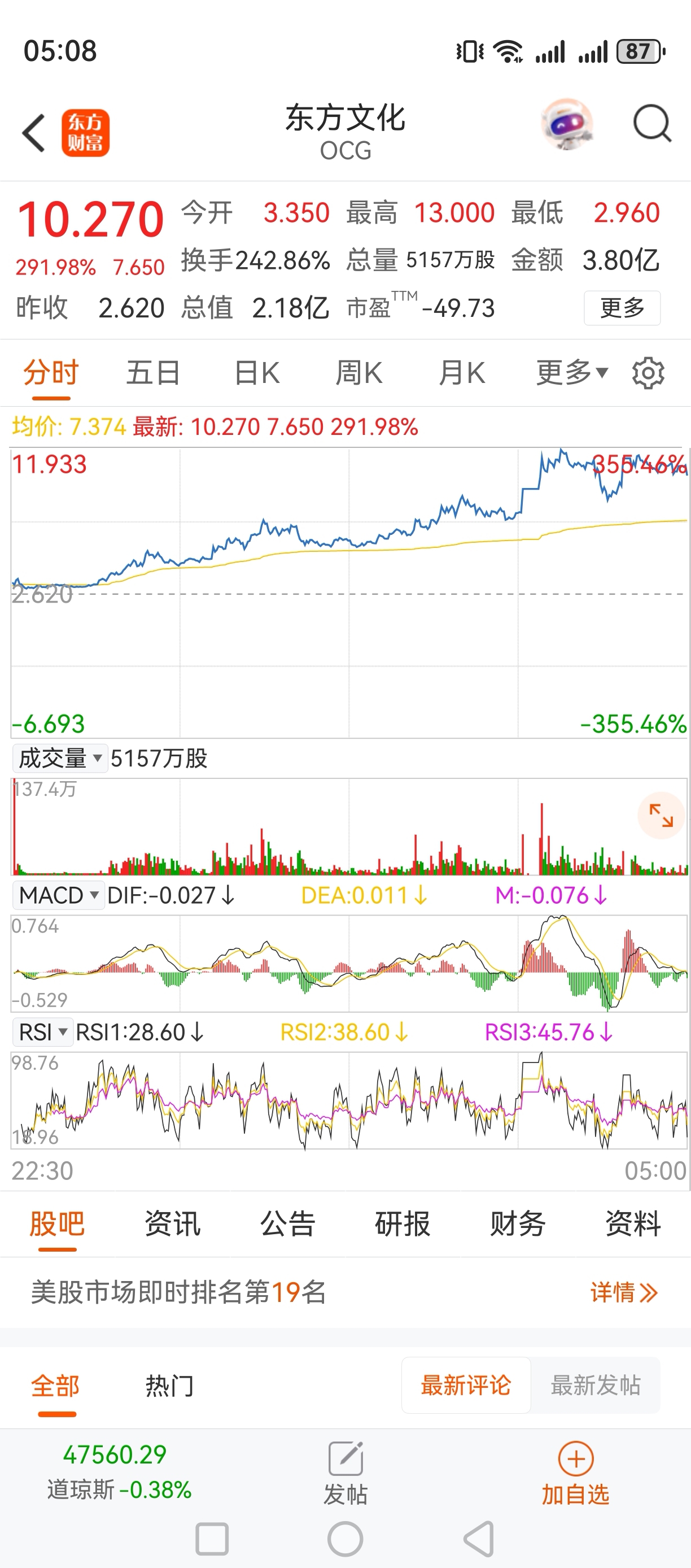 美股东方文化一日暴涨291%。会不会带动A股东方系起飞?期待东方财富今日有良好表