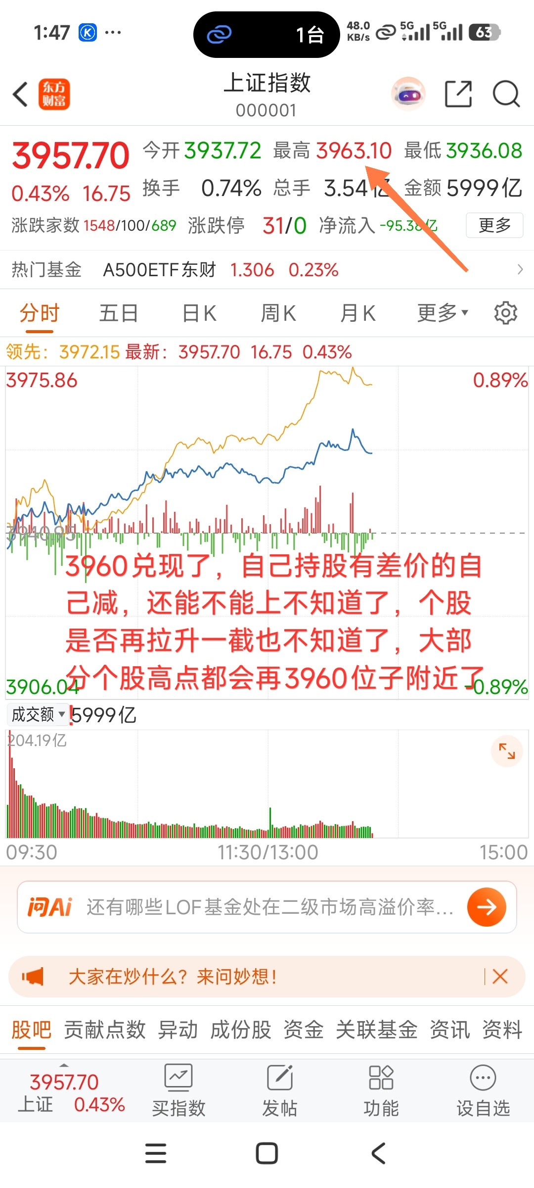 3960兑现了,自己持股有差价的自己减,还能不能上不知道了,个股是否再拉升一截也不知道了,大部分个股高点都会再3960位子附近了!$东方财富(SZ300059)$ $深证成指(SZ399001)$ $航宇微(SZ300053)$