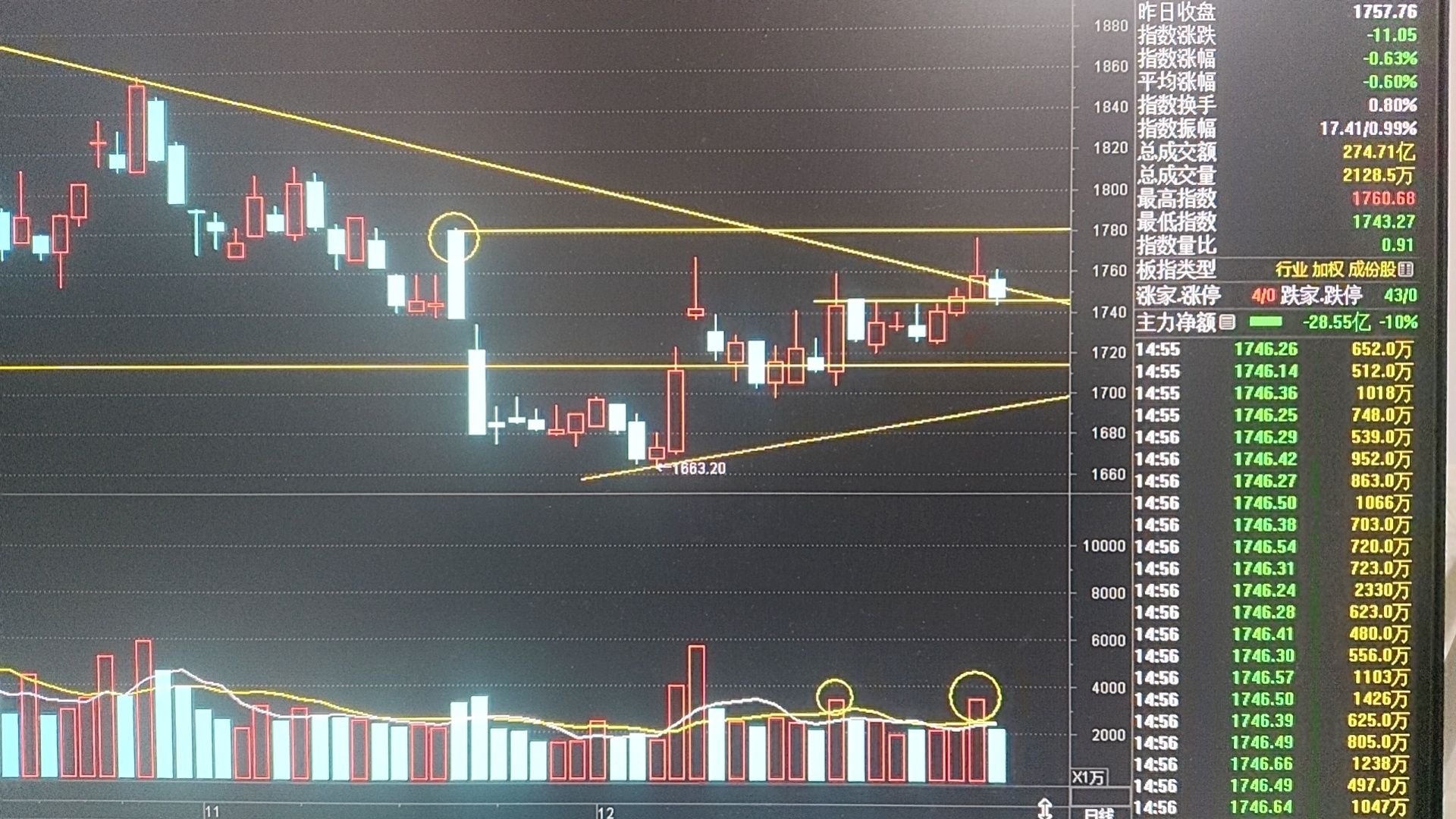证券板块今日大幅缩量收出阴孕线K线组合,那么昨日高量柱开盘价即是短线支撑位,明日不破这位置,那么这根长期下降趋线的突破可以确认有效的!上方压力位则参考11月20日高开低走大阴线的开盘价!