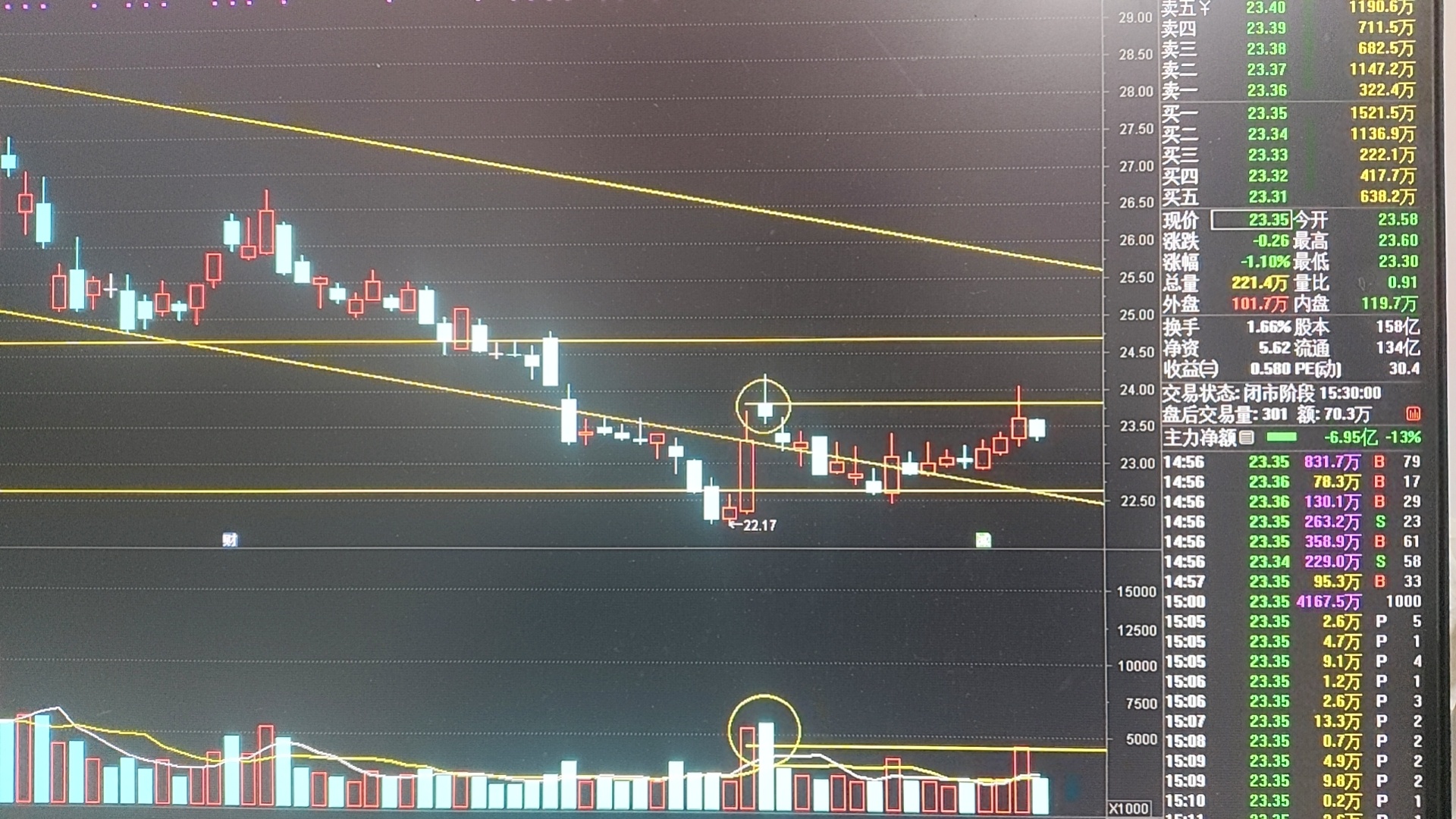 东财日K收出缩倍量的小阴K,直接回吐了周五的涨幅,昨日量价关系的图表里也介绍了缩倍量的意义!12月8日假阴真阳的开盘价23.8元有效站稳,则确认多头发出启动信号,上周五属于二次试盘信号,密切关注成交量变化!