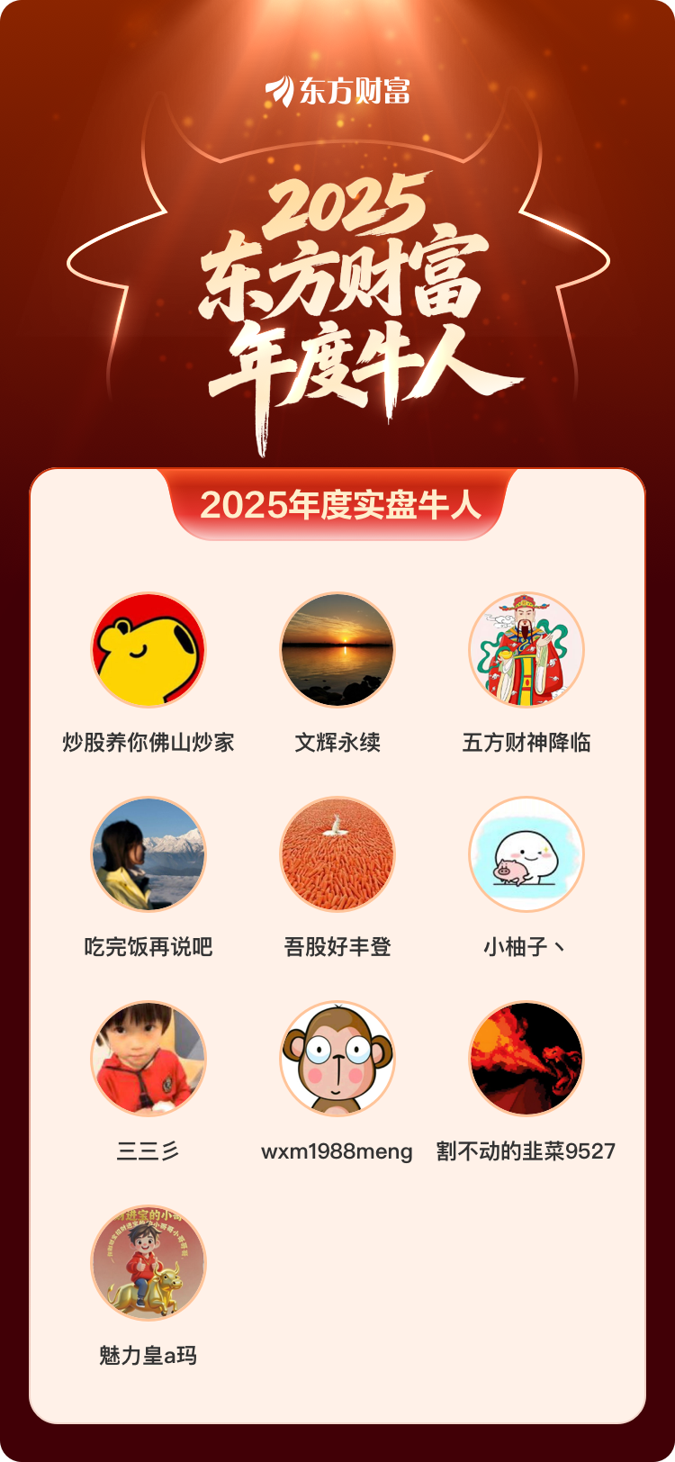 他们,是逻辑的践行者,是心性的修行者。用真金白银,为认知写下注脚。恭喜以下用户当选2025年度实盘牛人:@炒股养你佛山炒家 、@文辉永续 、@五方财神降临 、@吃完饭再说吧 、@吾谷好丰登、@小柚子丶 、@三三彡 、@wxm1988meng 、@割不动的韭菜9527 、@魅力皇a玛