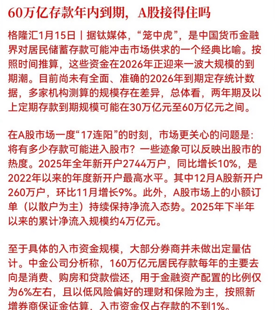 先理清楚:这30-60万亿到期的“笼中虎”,虽然中金说主要去向是消费、买房、还贷款,真能进A股的可能不到1%——但架不住A股刚走了波“17连阳”的热度啊!去年全年新开户2744万户(2022年来最高),12月新开户还环比涨了9%,散户小额订单下半年都净流入4万亿了,这增量资金的预期,足够让市场抖三抖。