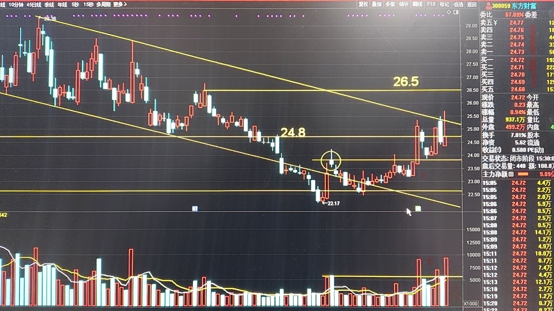 东财日K同样收出放量流星线,并未有效突破下降通道上轨压力,之前贴子讲过流星线的逻辑,上影线越长,则向上测试的幅度越大,从主力视角来看,我拉到高位,看看有多少人想卖,我不买了看看散户会不会接着买,最终目的让不坚定的人下车!