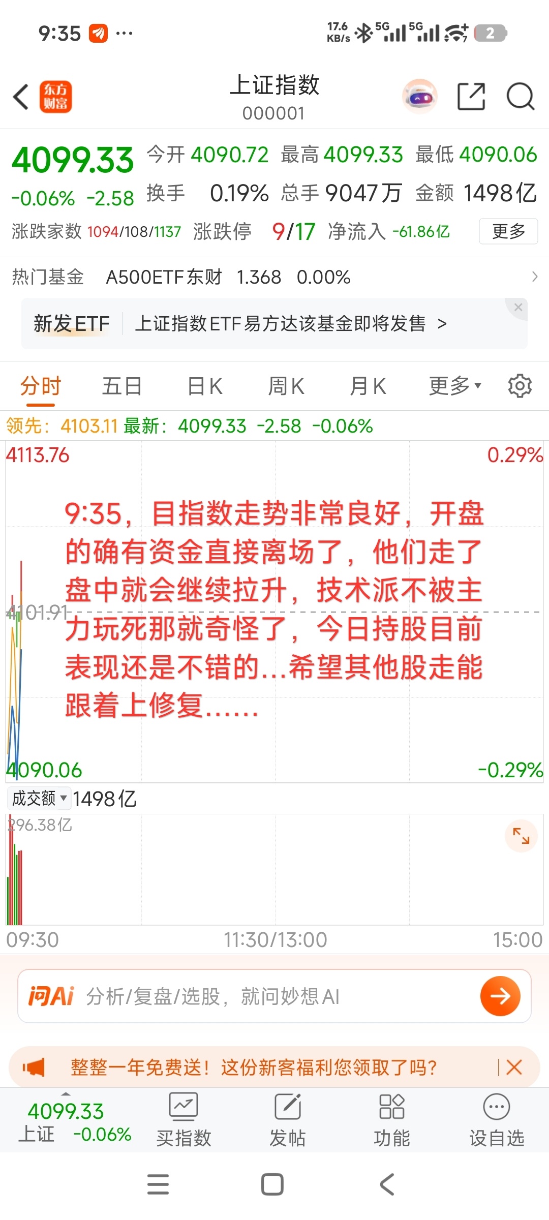 9:35,目指数走势非常良好,开盘的确有资金直接离场了,他们走了盘中就会继续拉升,技术派不被主力玩死那就奇怪了,今日持股目前表现还是不错的…希望其他股走能跟着上修复……