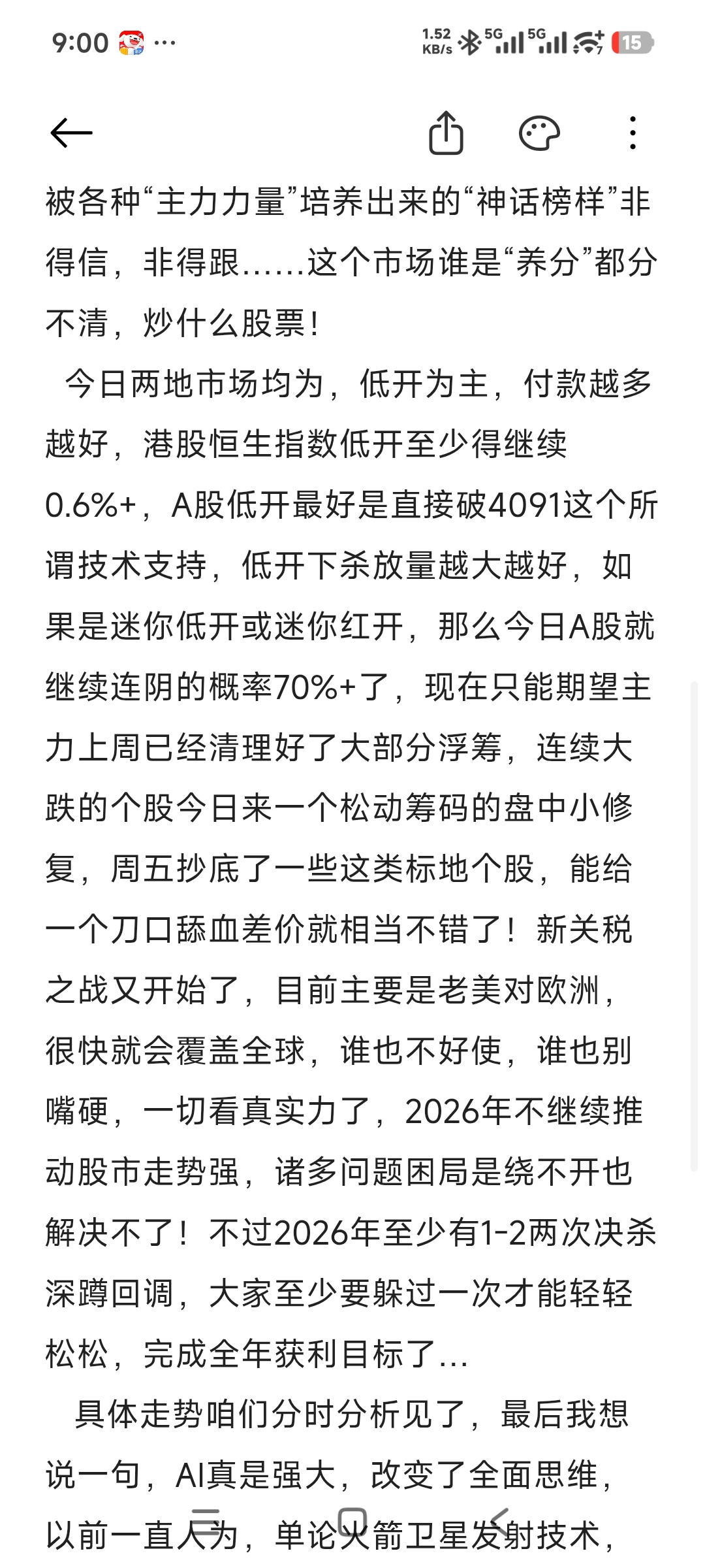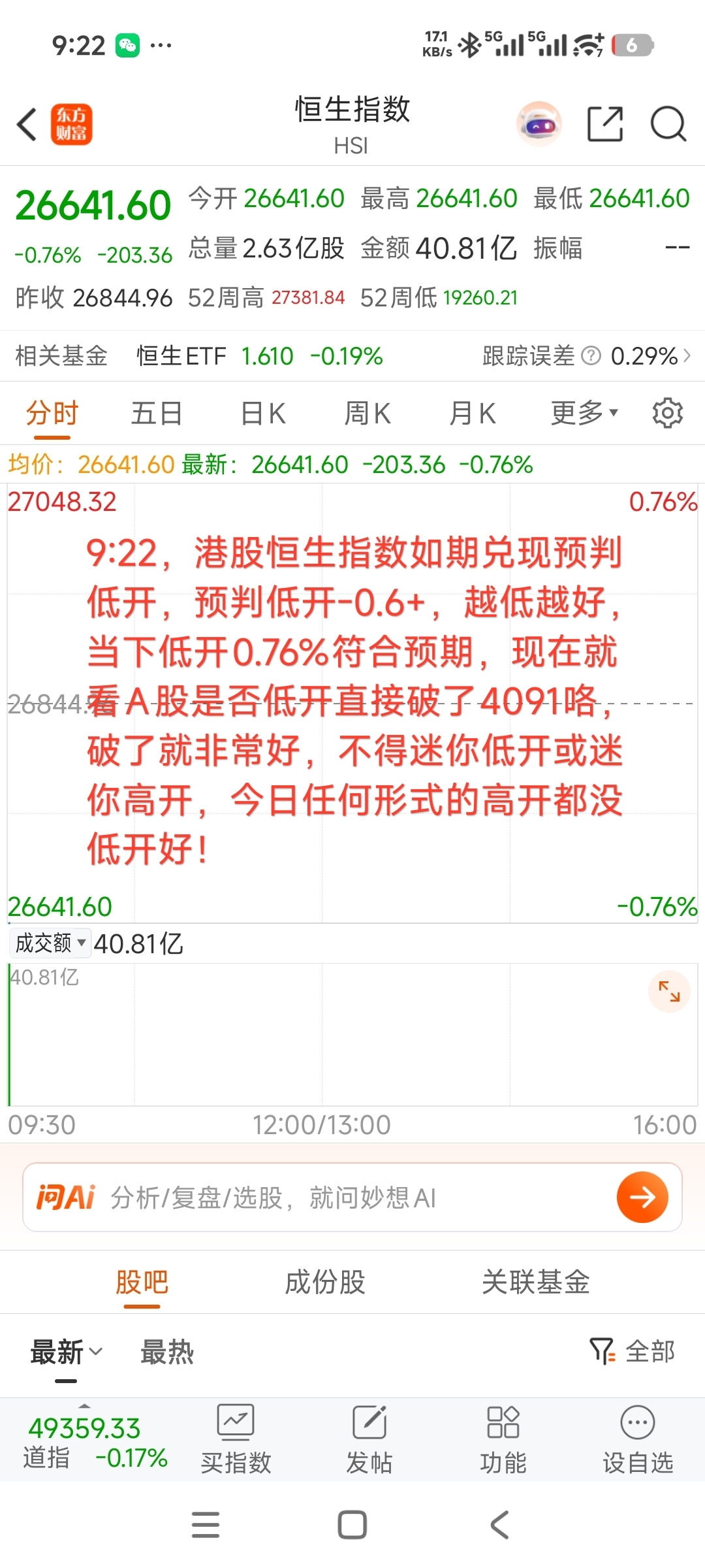 9:22,港股恒生指数如期兑现预判低开,预判低开-0.6+,越低越好,当下低开0.76%符合预期,现在就看A股是否低开直接破了4091咯,破了就非常好,不得迷你低开或迷你高开,今日任何形式的高开都没低开好!