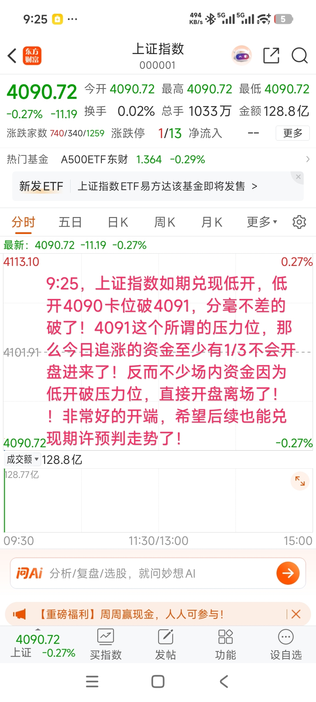 9:25,上证指数如期兑现低开,低开4090卡位破4091,分毫不差的破了!4091这个所谓的压力位,那么今日追涨的资金至少有1/3不会开盘进来了!反而不少场内资金因为低开破压力位,直接开盘离场了!!非常好的开端,希望后续也能兑现期许预判走势了!
