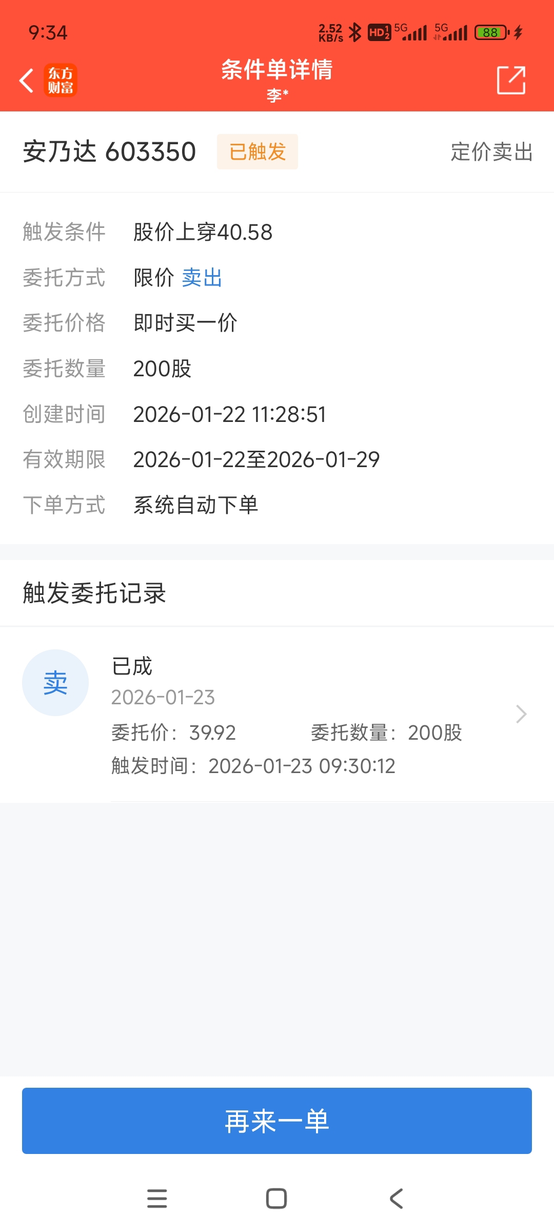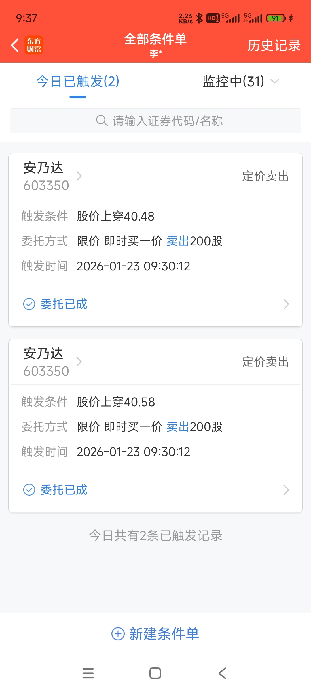 今天早上东方财富条件单出现问题,我设置上穿40.48元和40.58元触发卖出,结