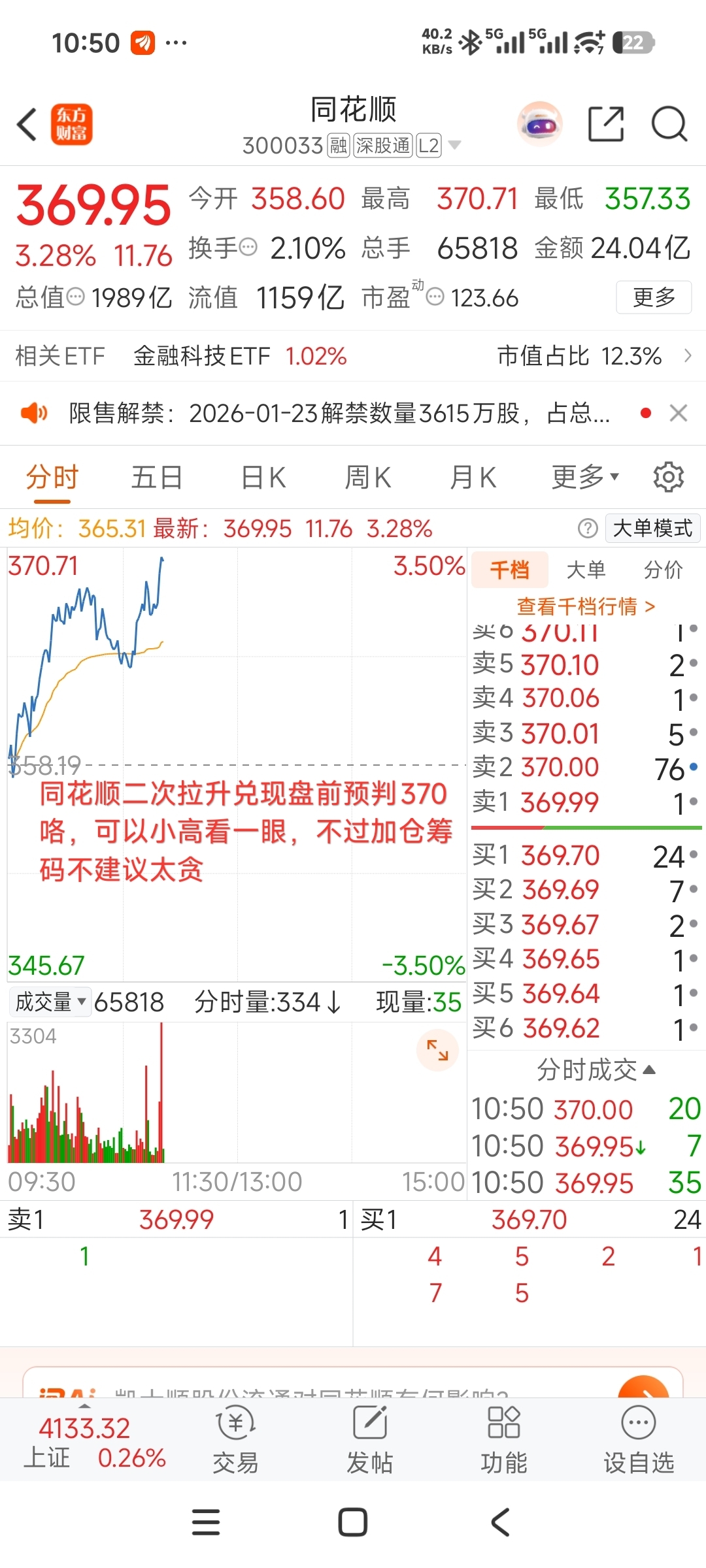 $东方财富(SZ300059)$ $上证指数(SH000001)$ $同花顺(SZ300033)$ 同花顺二次拉升兑现盘前预判370咯,可以小高看一眼,不过加仓筹码不建议太贪