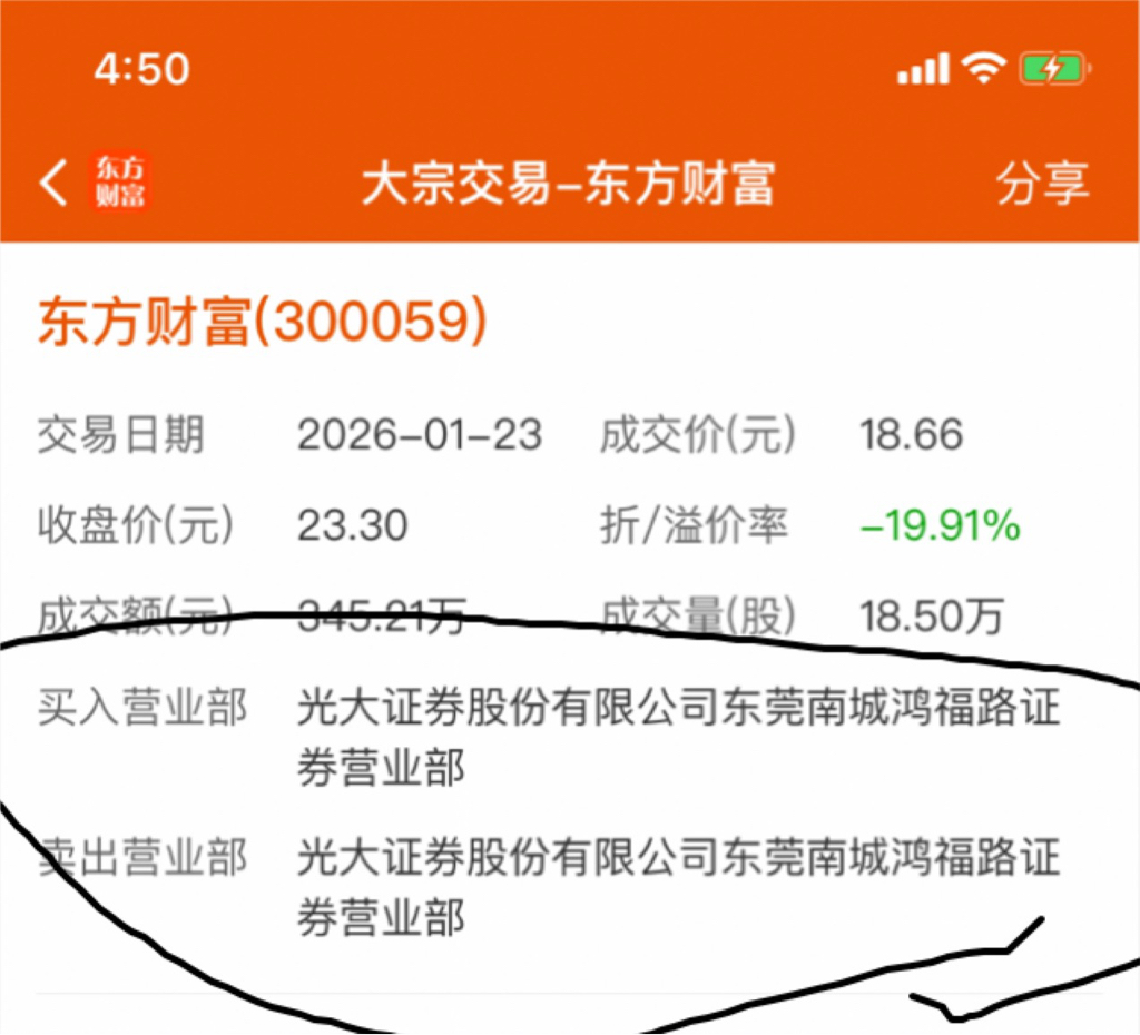 $东方财富(SZ300059)$ 大宗交易买卖双方都是同一个地址,同一个营业部。还折价这么多说明了啥呢,哈哈此地无银三百两!