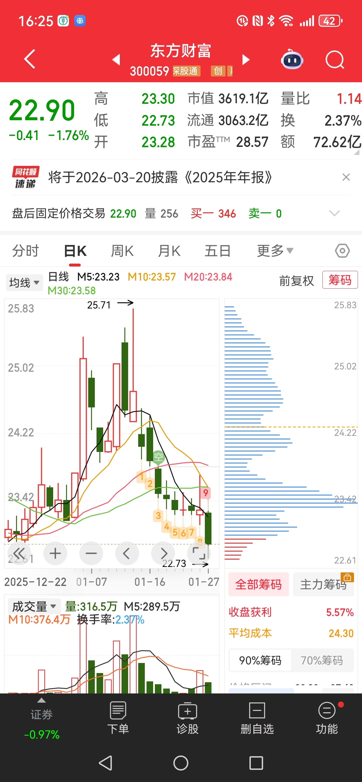 $东方财富(SZ300059)$ 今天东方财富又破23元整数关口,获利的人不足6%。春节前东方财富的股价会在23元附近震荡,这符合证监会的漫慢牛行情。