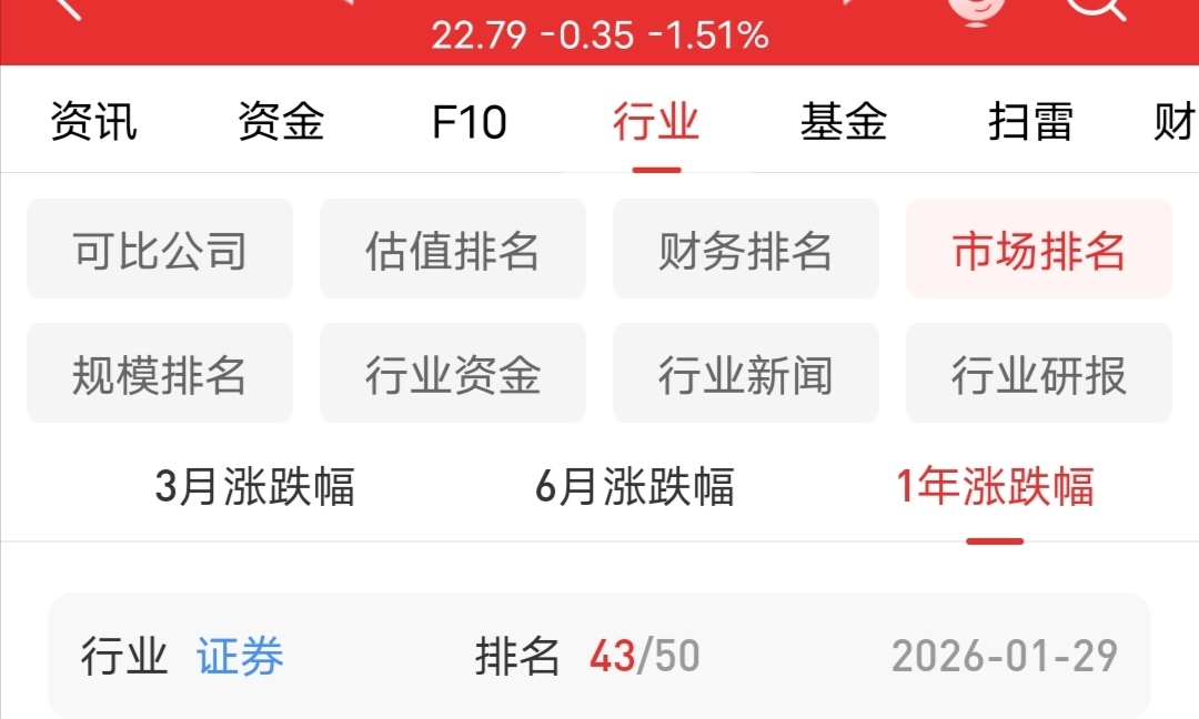国联民生一年以来跌了8.84%,相比之下东财已经很稳健了,尽管券商板块排名第43