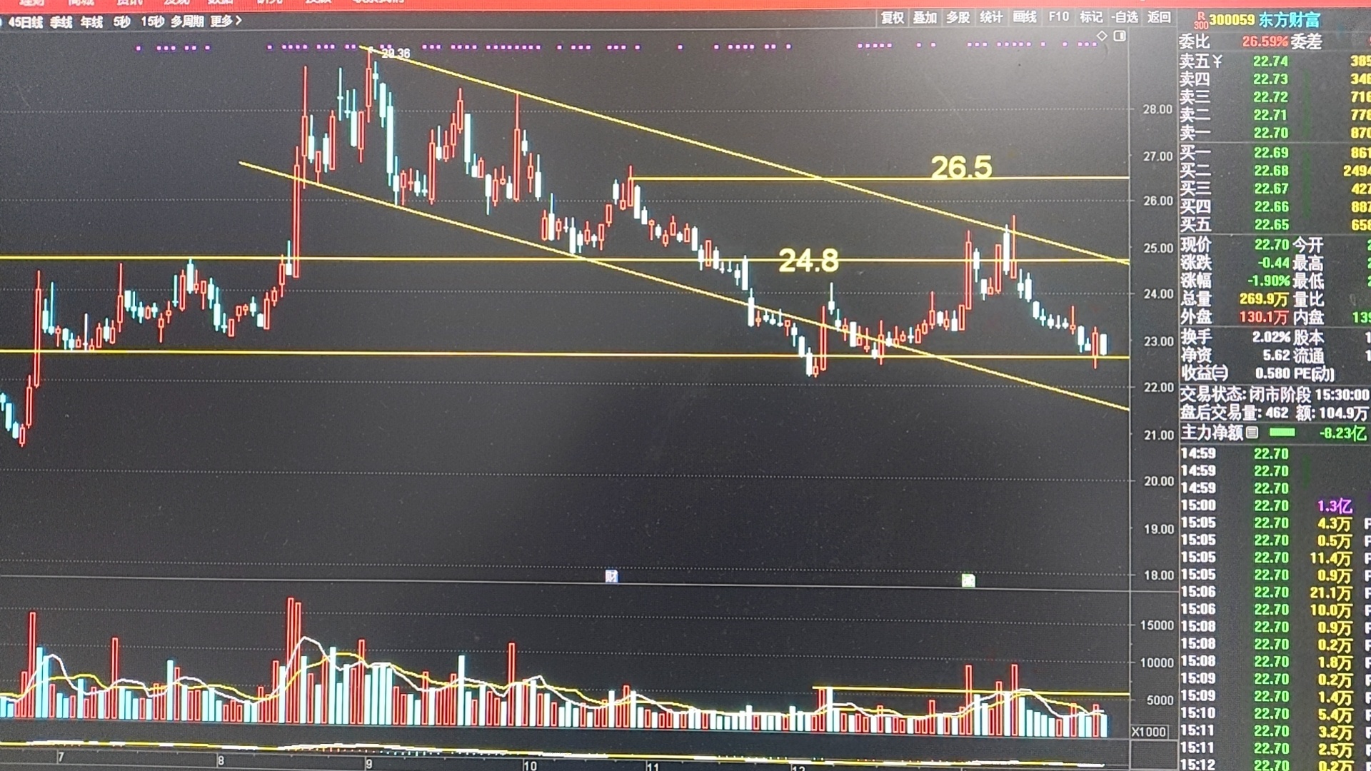 东财日K今日小幅缩量,收出包含在昨日阳线实体内的阴孕线组合,这种小阴小阳就属于磨底的无效时间,这个大双底的右底构筑完成后,才会迎来真正意义上的主升行情!从22.17元低点运行至25.71元看作3浪3-1上涨驱动浪,那么最近11个交易日可视为3浪3-2的调整驱动浪,突破24.8元箱体上轨将会迎来加速段!
