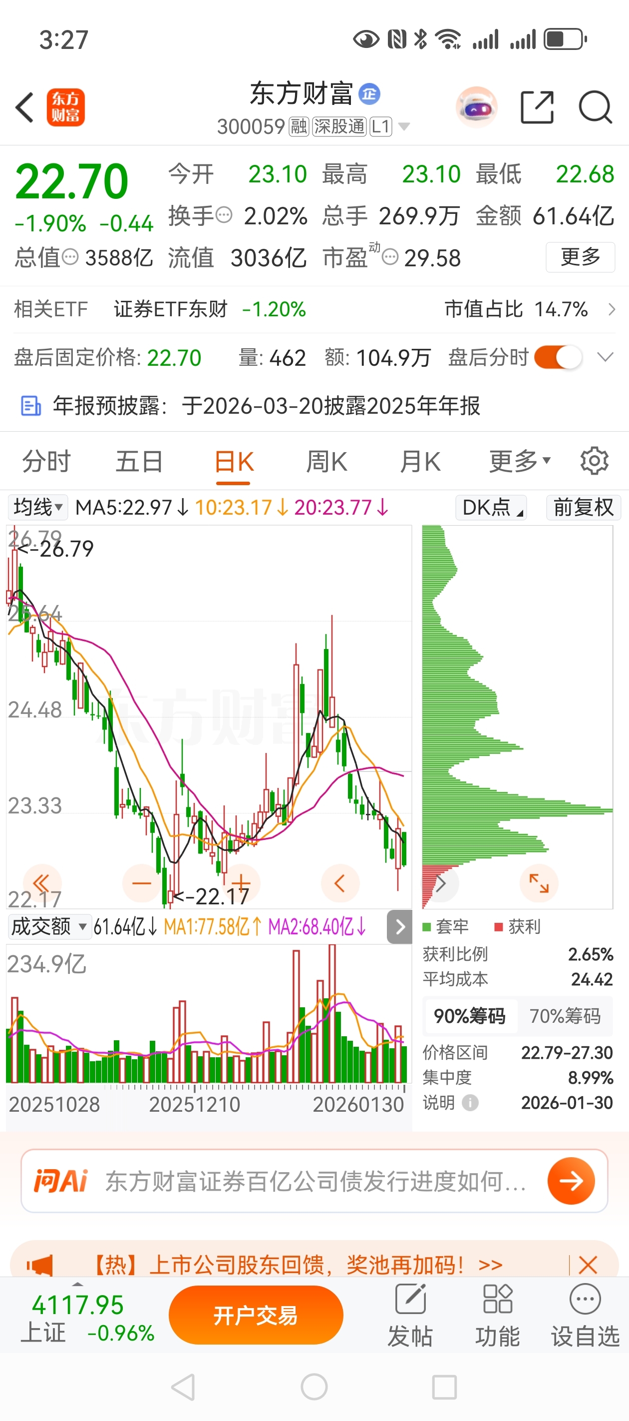$东方财富(SZ300059)$ 牛市的好漂,获利盘2.65%