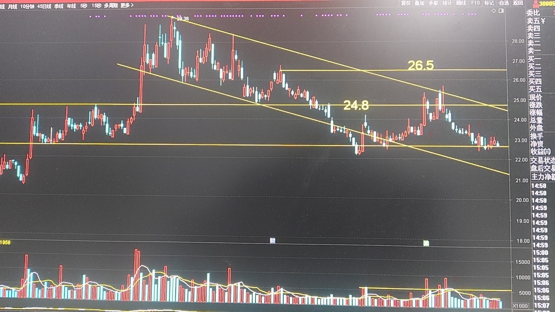 东财日K同步缩量收倒锤头小阴K,并未跌破箱体下轨,大双底的结构已经形成,下面就重点关注如何去突破下降通道上轨的压力!下周还有最后5个交易日,24.8元和26.5元压力位,年前哪个能站上,还是值得期待的!