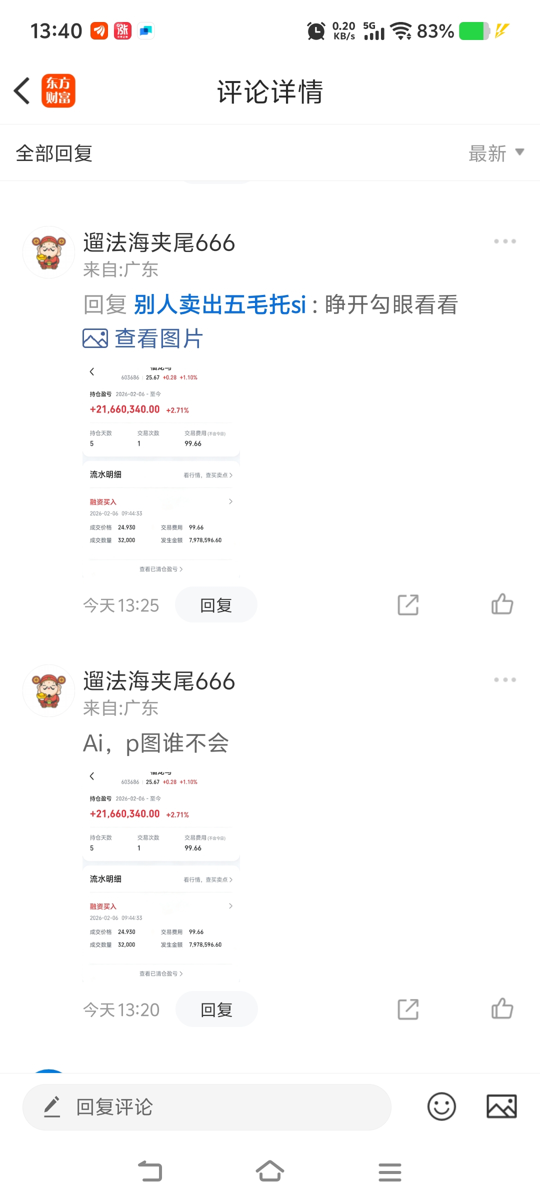 $东方财富(SZ300059)$ $继峰股份(SH603997)$ $新华百货(SH600785)$ $继峰股份(SH603997)$ 哟呵,把老子的实时截图既不能把时间更改亏你丫好意思说大话呢,狗托。这就是你们实时截图不了的原因,然后你却不知道自己截图有多假。笑死。这不就是别人卖出晒的同一个账号一会赚50万一会赚250万的250把戏么。笑死