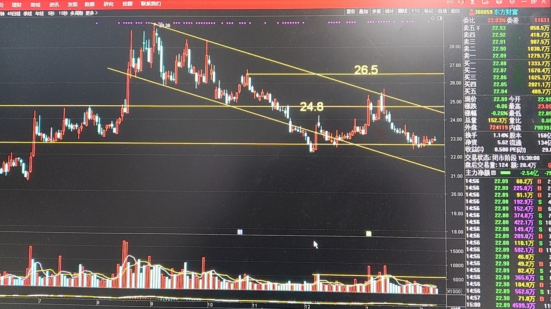 东财日K今天最大看点就是收出近半年多来地量的水平,小阴小阳都属于无效时间,关注能改变趋势的高量阳线的产生,以及突破上方24.8元平台后,确认趋势反转的信号!