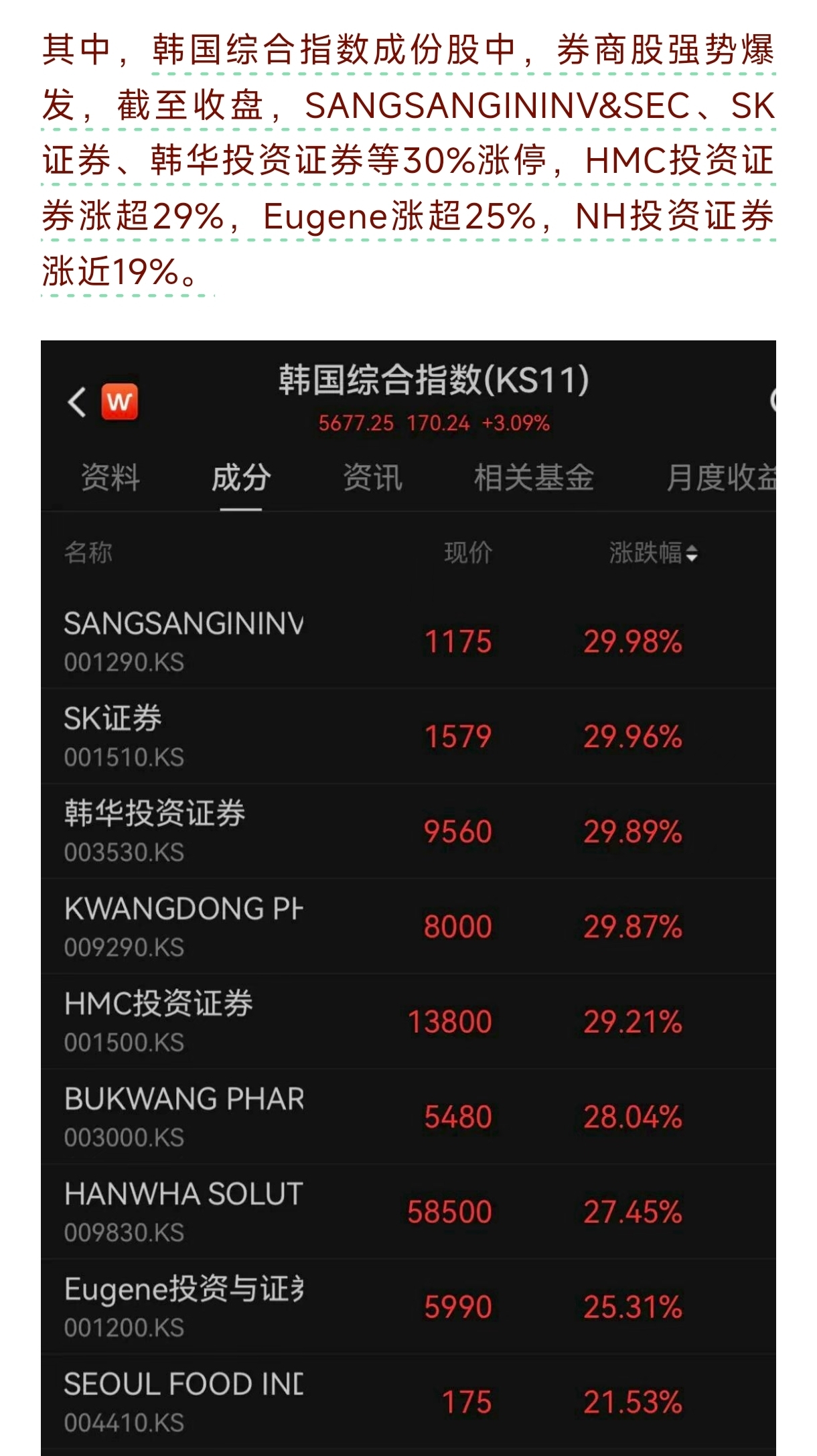 今天韩国券商板块集体涨停了,而且都是30%的涨停板。