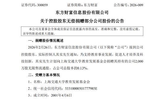 2月26日晚间,东方财富发布公告称,接到公司控股股东、实际控制人其实通知,为支持教育事业发展,促进人才培养及科技创新,其实计划向上海交通大学教育发展基金会捐赠其持有的公司2000万股无限售流通股,占公司总股本的0.13%。