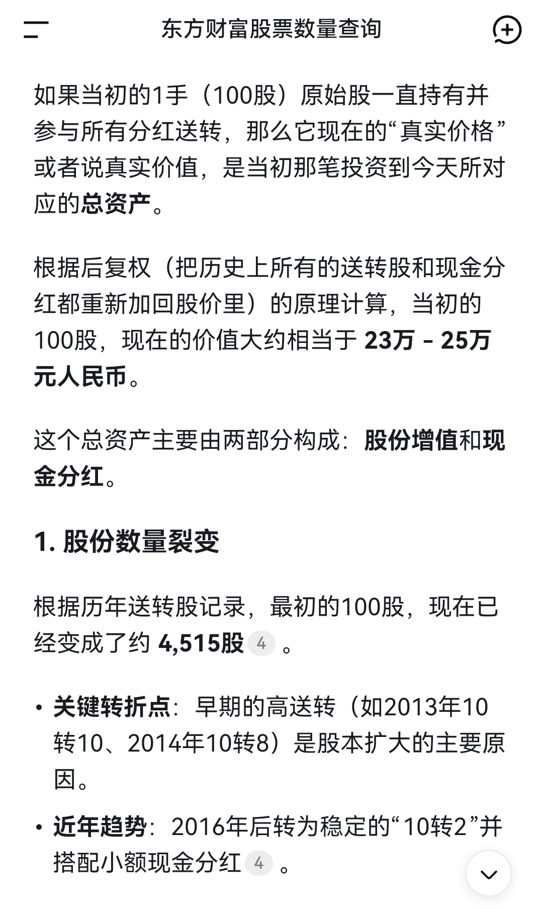 东方财富原始股一手股票到现在的真实价格大约是23-25万。也就是说你持有原始股一手股票,把每一次分红的钱全部投入到这个股票里面到现在就是23-25万。