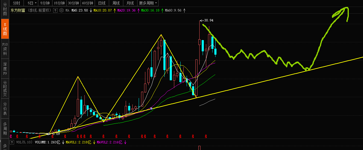 中东战争导致全球流动性的严重收缩,东方财富季度线要出绿角线破零轴,形成季度一笔下