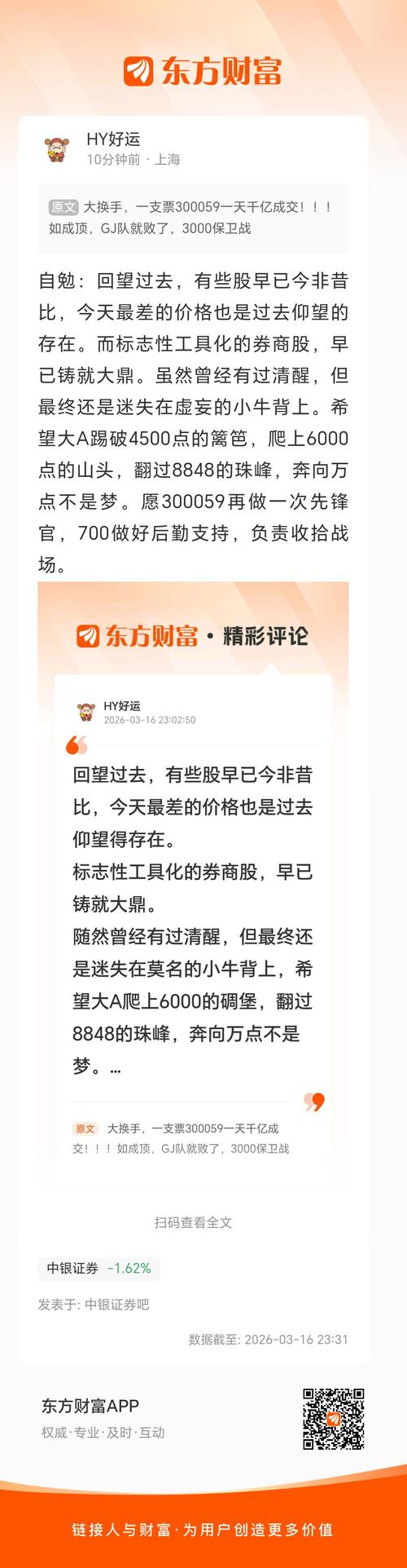 $中银证券(SH601696)$ $模塑科技(SZ000700)$ $东方财富(SZ300059)$ 大换手,一支票300059一天千亿成交!!!如成顶,GJ队就败了,3000保卫战继续。