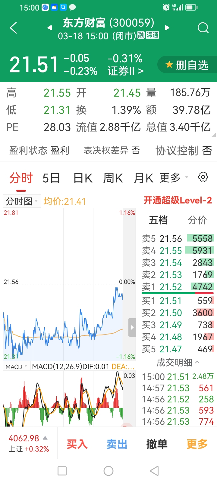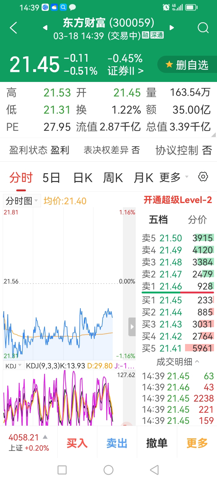 $东方财富(SZ300059)$ 东方财富最新战报,下午14点40分,东方财富成交额35亿,符合预期,最后成交额39亿,最后多出四亿是14.40分,多空大战焦点是在,21.56多头想拉,空头打压,最终收盘在21.52,明天继续观察