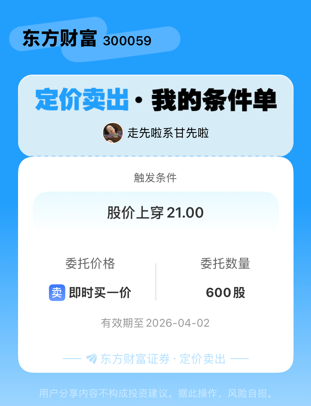 #条件单交流# #定价卖出晒单# 一位股神设置了一个定价卖出条件单,接下来就是见证奇迹的时刻~$东方财富(SZ300059)$