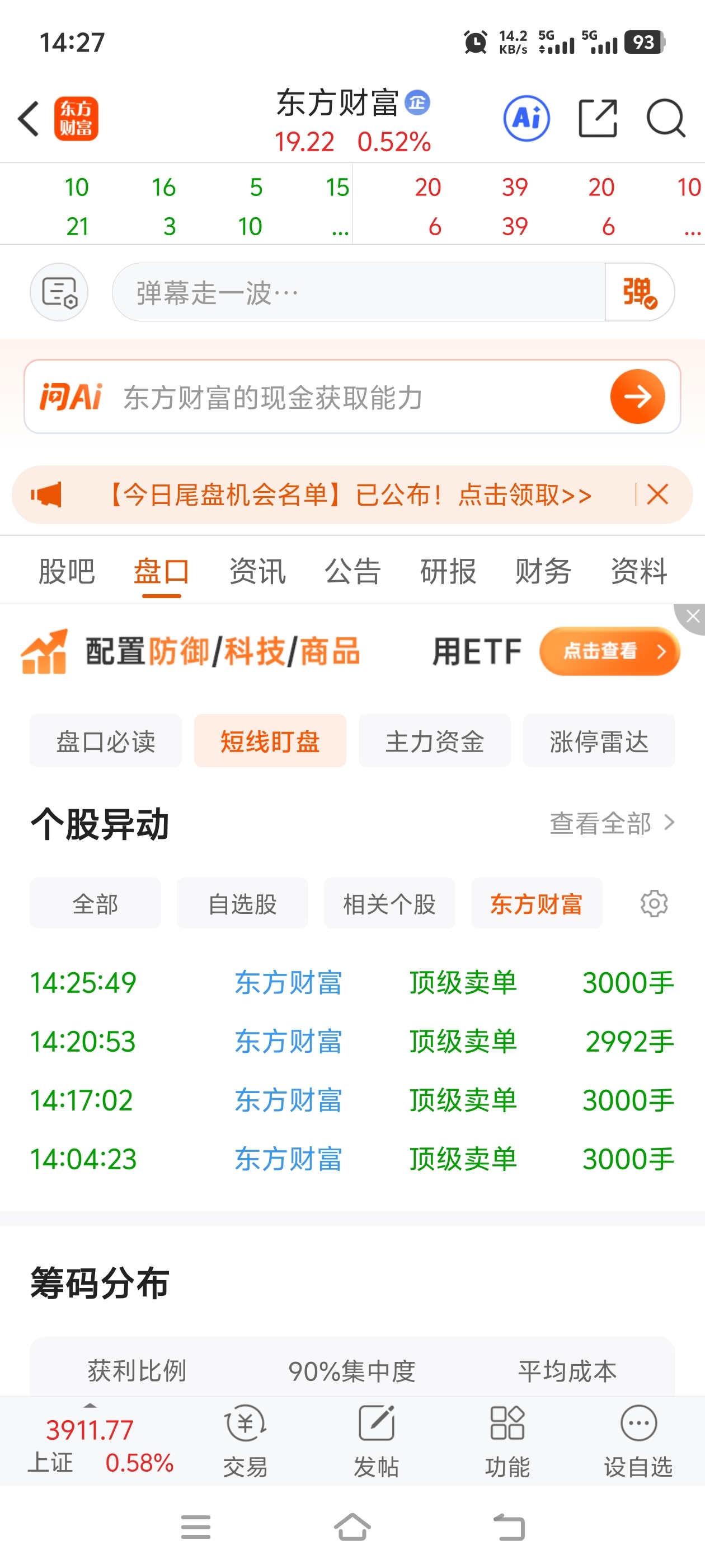 东方财富真够烂的!!次次压盘大卖单不断!!!!
