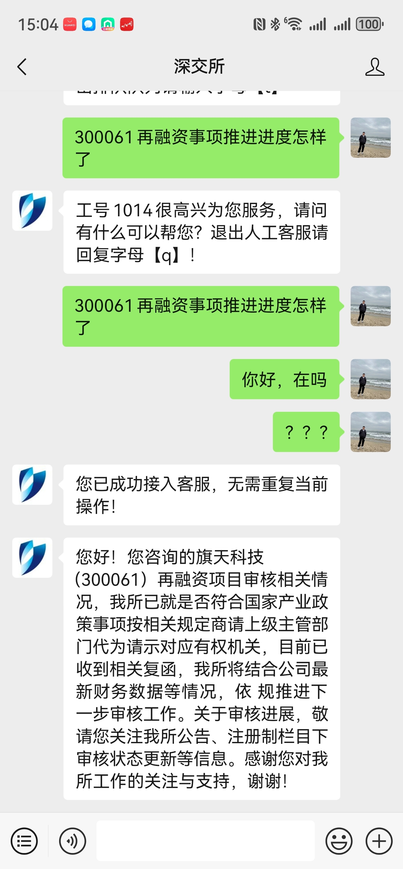 $旗天科技(SZ300061)$ 刚问了人工客服,真的收到复函了