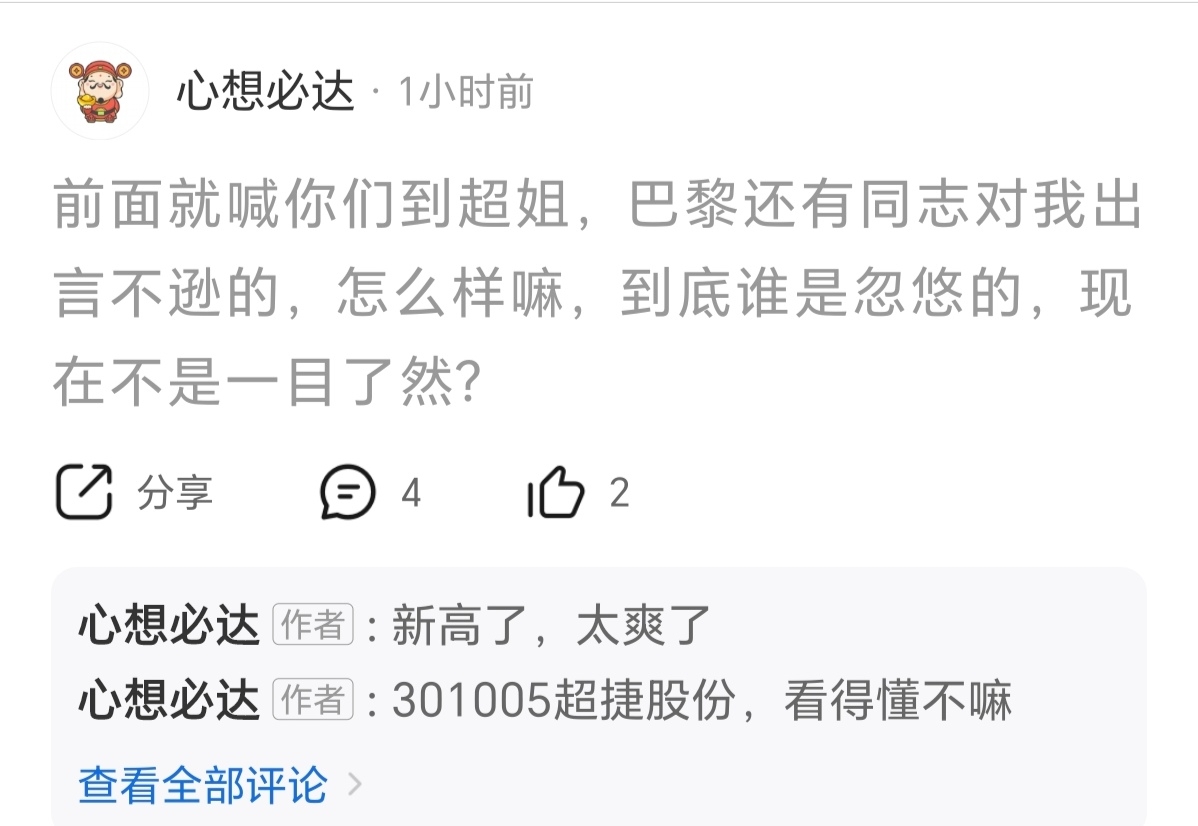 温馨提示: 1.根据《证券法》规定,禁止编造、传播虚假信息或者误导性信息,扰乱证券市场;2.用户在本社区发表的所有资料、言论等仅代表个人观点,与本网站立场无关,不对您构成任何投资建议。用户应基于自己的独立判断,自行决定证券投资并承担相应风险。《东方财富社区管理规定》