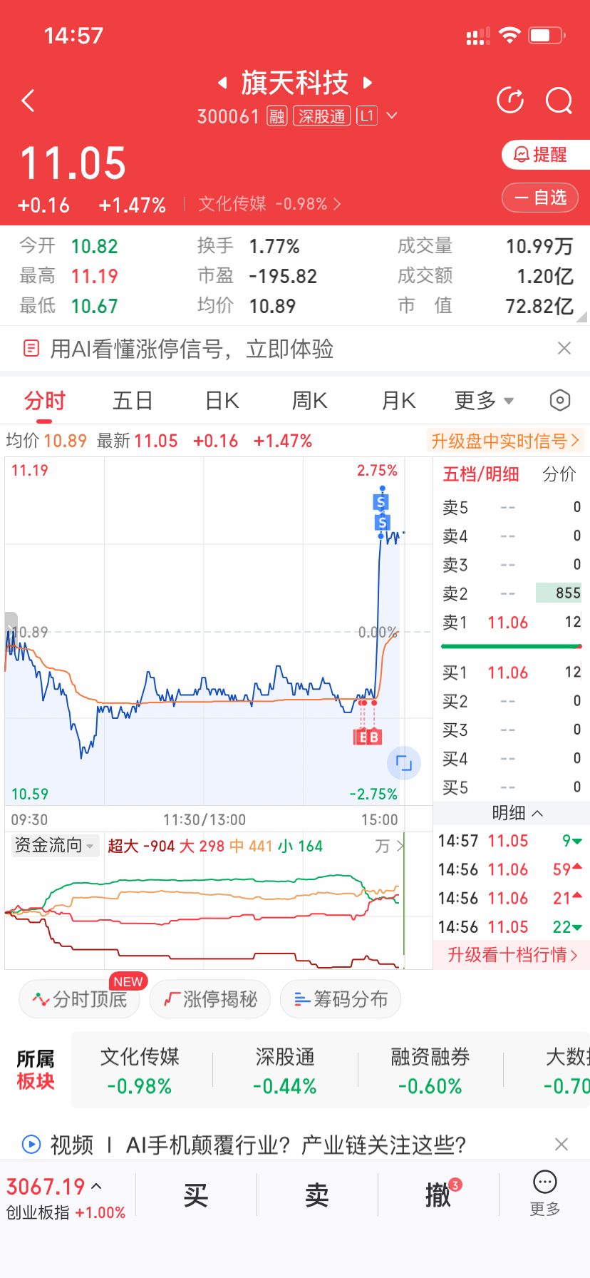$旗天科技(SZ300061)$ 感谢旗天今天让我的帐户由亏几千变赚钱了