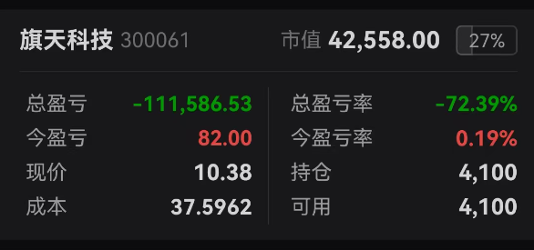 说说我的旗天持仓!!!目前降低了七成仓位,还剩4100股,亏损最严重的一支。剩下的留着等消息吧。