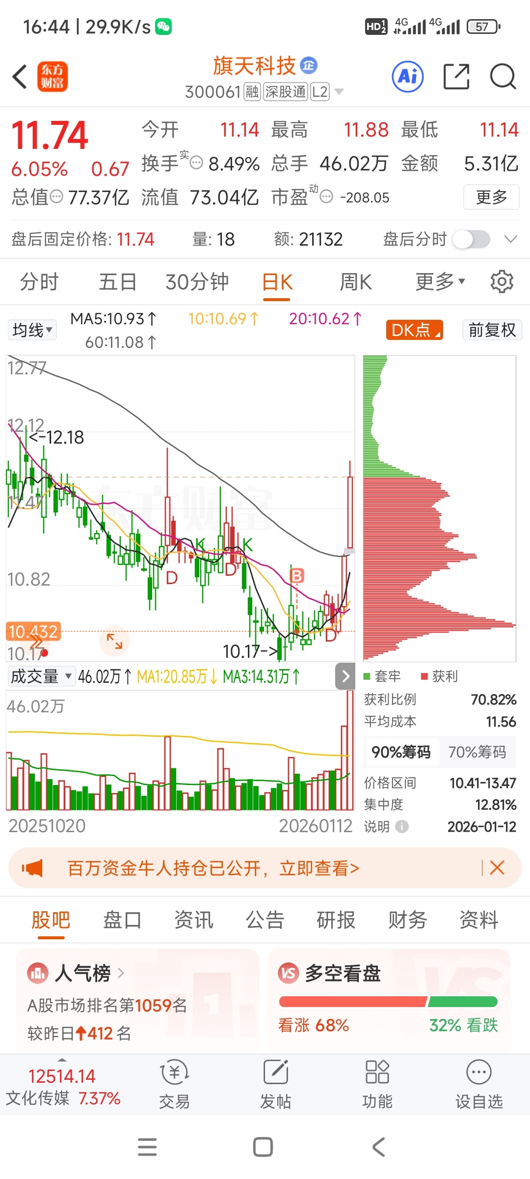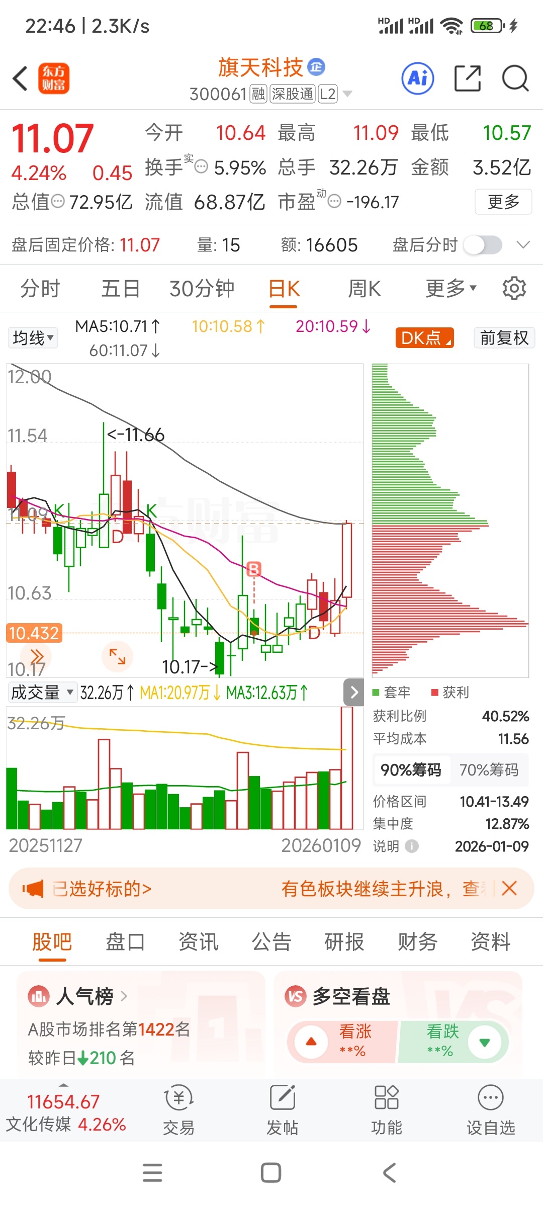 $旗天科技(SZ300061)$ 参与时价位较低,与各位高手学习,多多关照#周末杂谈# #复盘记录#