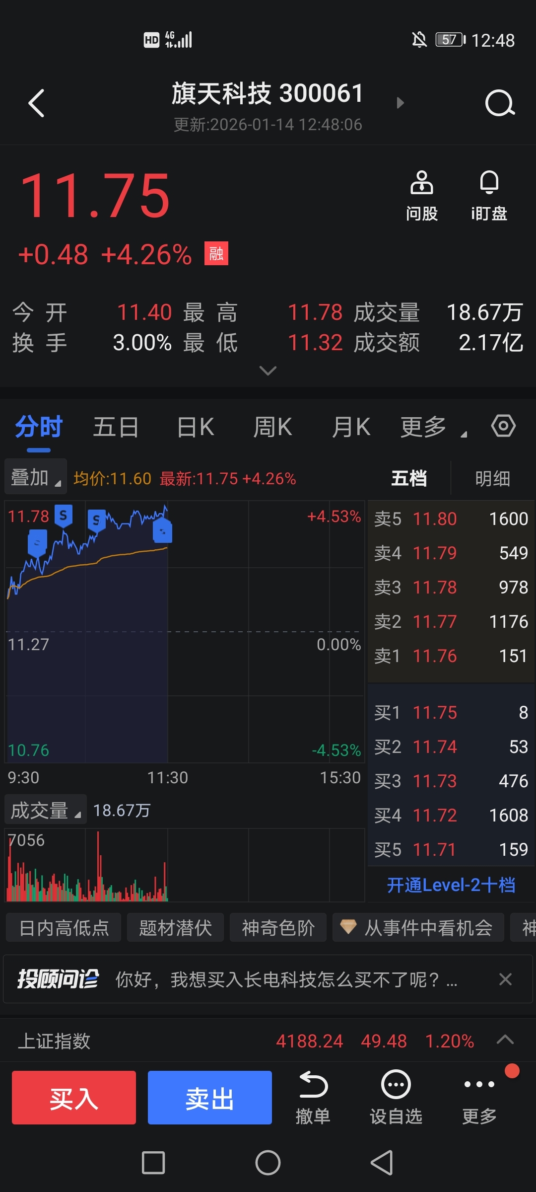 早盘10点前,成交量接近1亿,但没有达到1亿,无条件抛出两单!然后涨幅远远不及板块,个股还是偏弱!不可否认,卖飞了!下午有冲击12元整数关口势头!先抛了6单,只能逢机入场吃货!看好你,下午来个涨停板起爆吧!