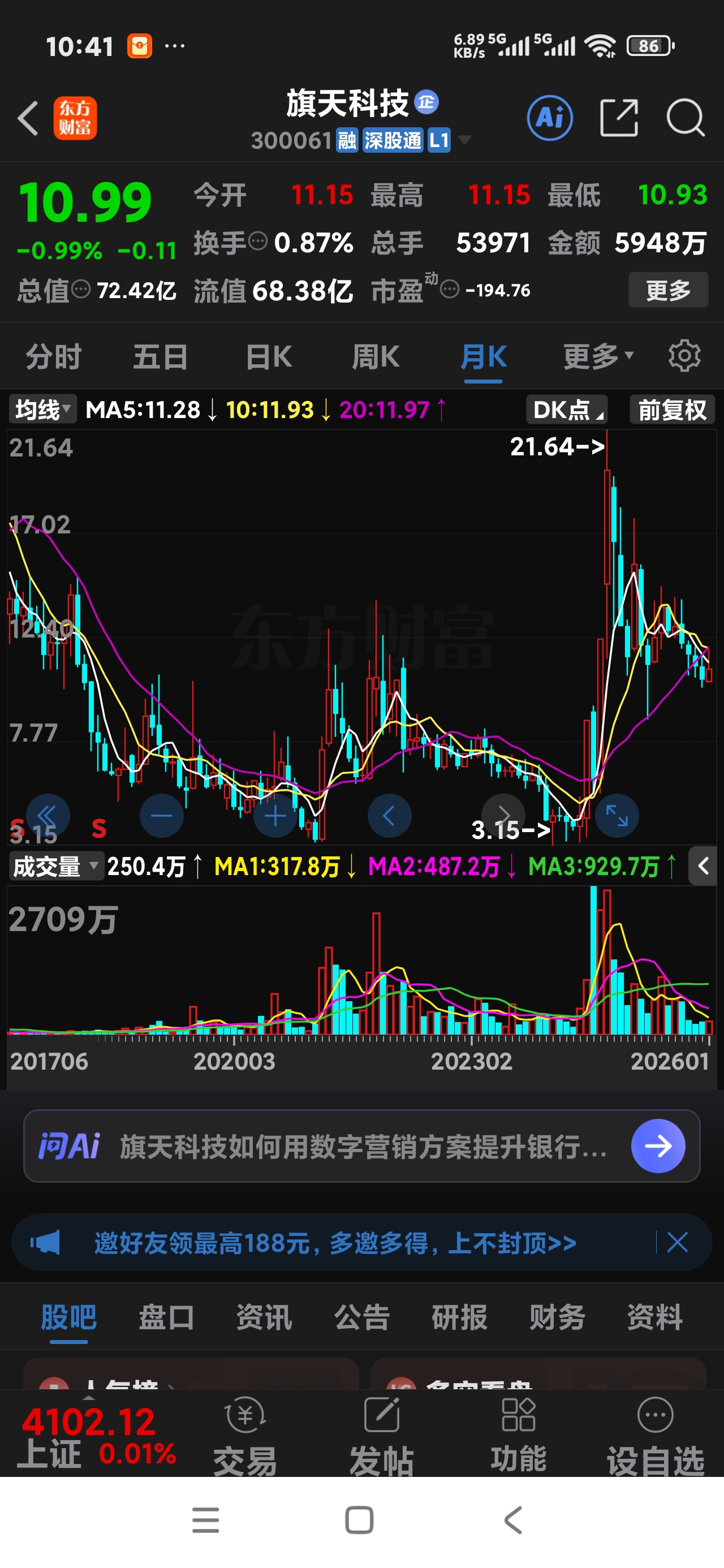 $旗天科技(SZ300061)$ 下跌趋势已形成,千万不要买,可能要去3.89元