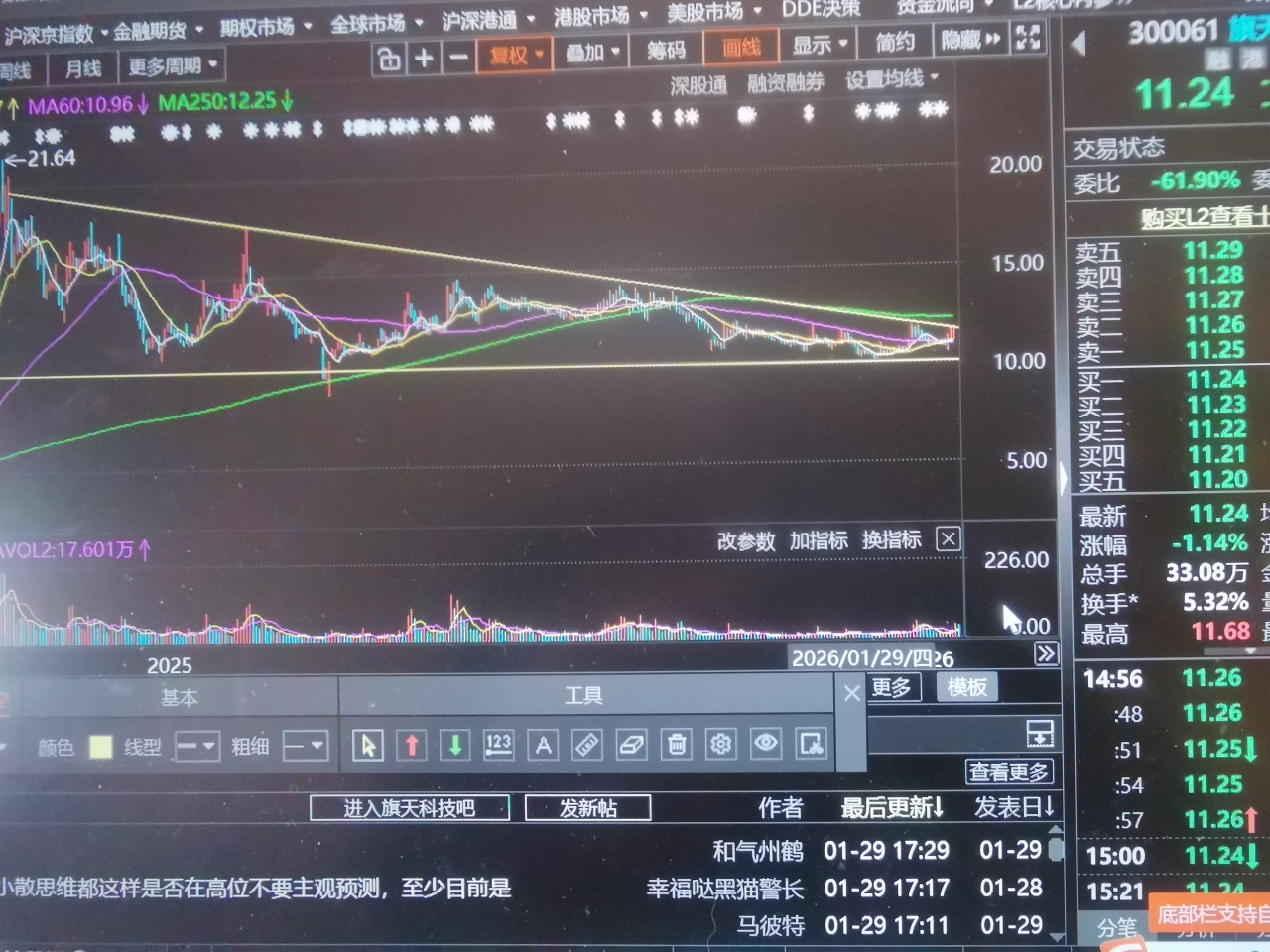 大型三角形整理形态:旗天科技在2024年9月12日从6.50元启动,至10月29日达到21.64元高位,涨幅接近四倍。随后进入超过一年的调整期。以这波上涨作为“旗杆”,以2024年11月至2026年1月的四个高点(21元、15.64元、13.67元、11.37元)连线构成下降趋势线,形成了大型三角形整理形态。目前股价已运行至三角形末端,面临方向选择。嵌套头肩底形态:在大三角形形态内部,同时构建了一个头肩底形态:· 左肩:2025年10月13日10.71元· 头部:2025年12月23日10.17元