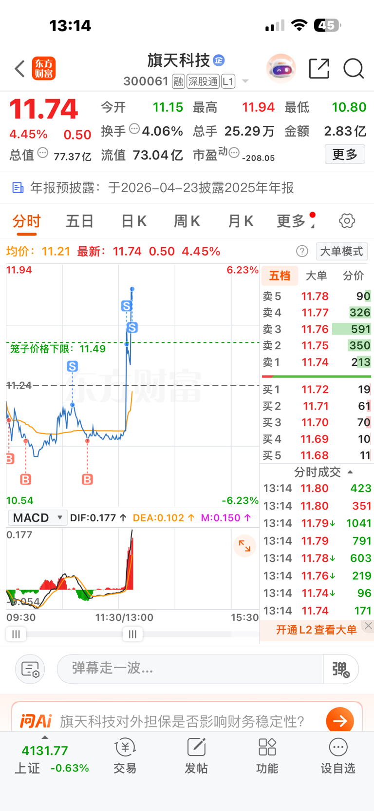 $旗天科技(SZ300061)$ 做了3个点的踢