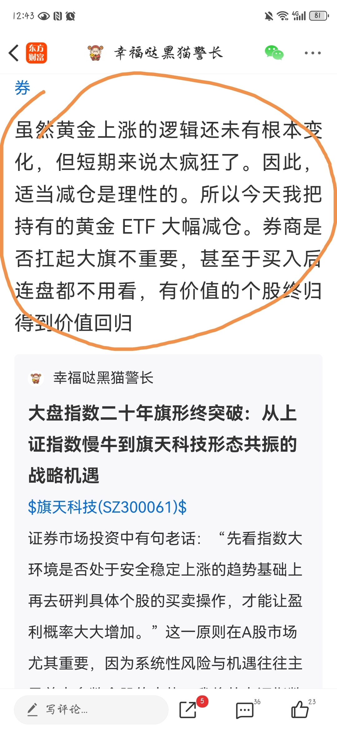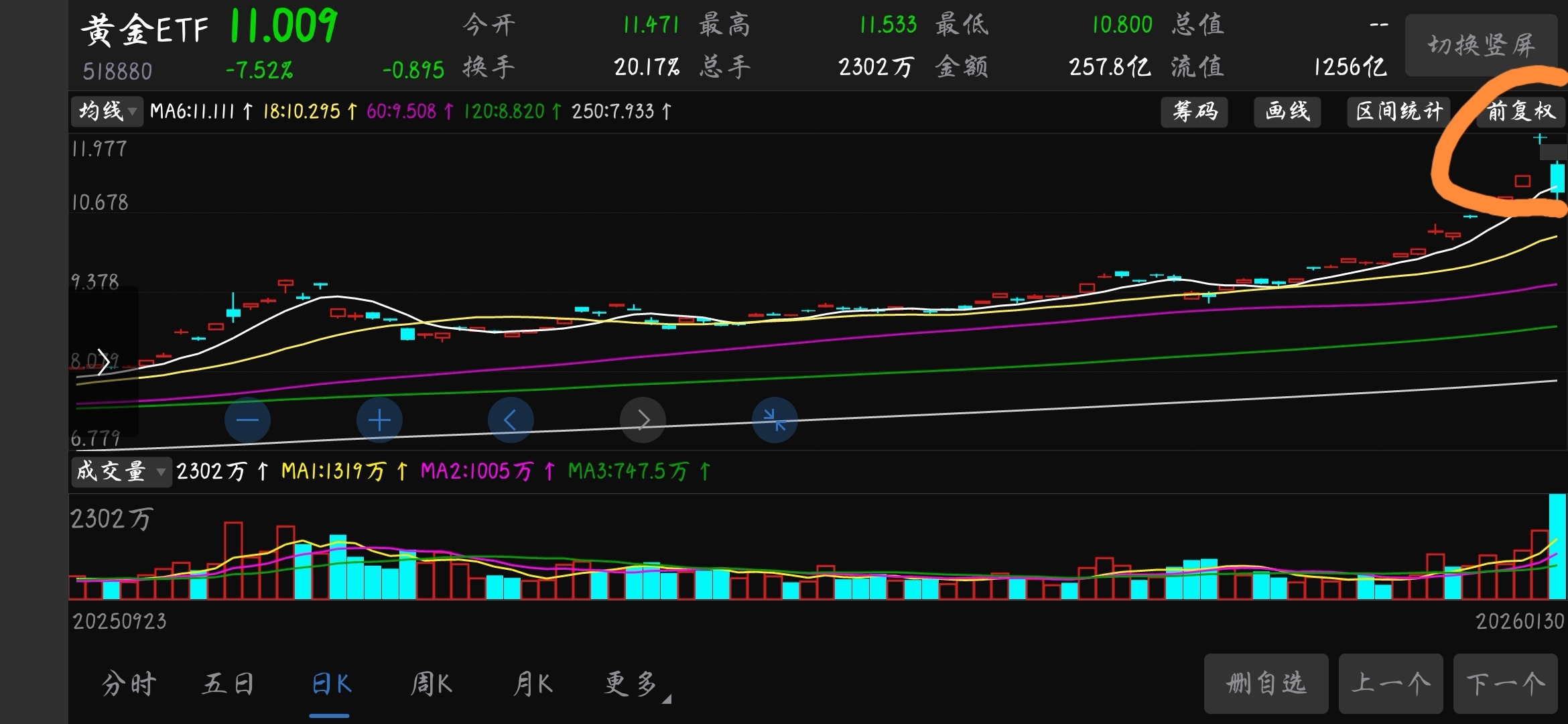 说回大盘,今天指数的大幅震荡是因为一段时间有色金属,黄金白银等稀有金属太疯狂的操作后短期获利盘蜂拥而出形成的。我多次提及要卖在人声鼎沸处的观点又一次得到了验证,市场上没有只升不跌的品种。本人在昨天已经在帖子里公开说明且知行合一的大幅度减仓黄金ETF和中稀有色,虽然黄金白银上涨的逻辑未有根本变化,但是当到了身边每个人都在讨论黄金的时候也就离阶段性顶部不远了。今天大盘指数的调整以及大震荡是好事情,一则清洗了获利筹码,二则把一些不坚定的散户赶下了车,三则,量能重回健康水平。今天大盘指数打到4064点靠近30日均线的位置止跌就充分证明了管理层对于股市乃至金融市场调控水平之高!虽然说今天指数下跌了,但是大盘运行态势是健康的,慢牛行情是延续的。因此,每一次遇到大盘指数深福回调就是上车的好机会!下周乃至春节长假前预计大盘指数会在4060点至4200点之间震荡蓄势,节前会有一个红包派送给价值投资者。