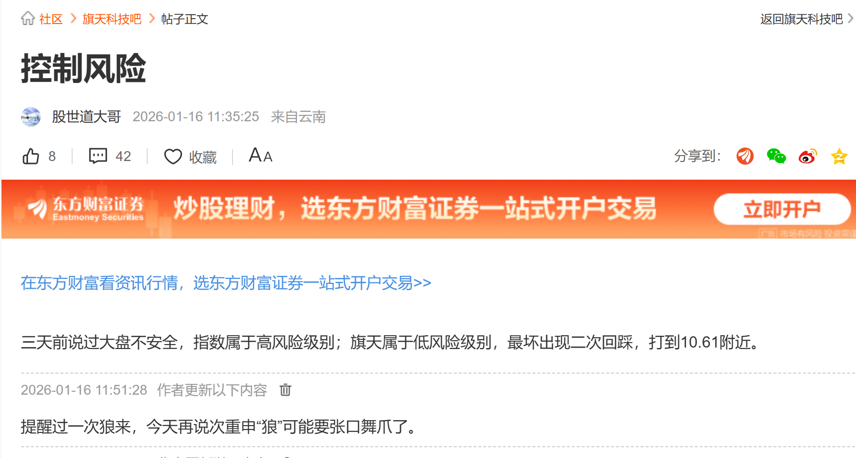 温馨提示: 1.根据《证券法》规定,禁止编造、传播虚假信息或者误导性信息,扰乱证券市场;2.用户在本社区发表的所有资料、言论等仅代表个人观点,与本网站立场无关,不对您构成任何投资建议。用户应基于自己的独立判断,自行决定证券投资并承担相应风险。《东方财富社区管理规定》