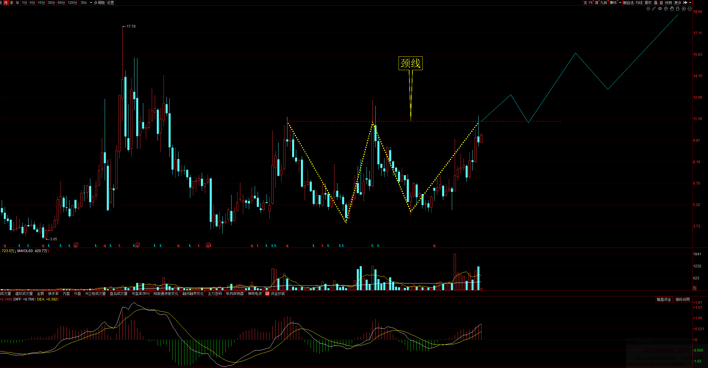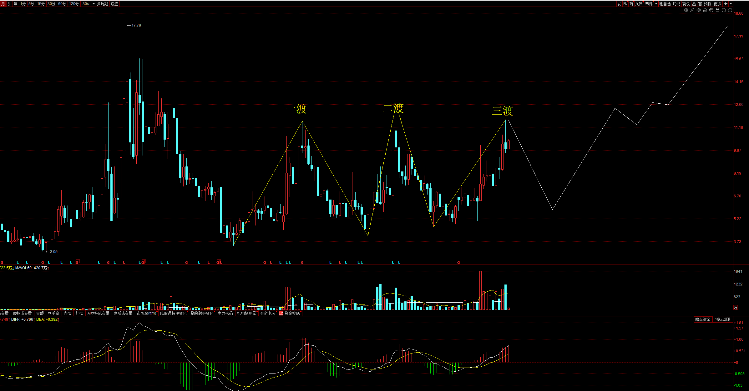 通达很有规律21时间窗的长期运作,已经进行到第三渡,不出妖蛾子事件的话可能进行不下去了,因为有题材业绩支撑,很难再出现第四个相对平行低点了,所以排除大型四渡赤水整理形态。