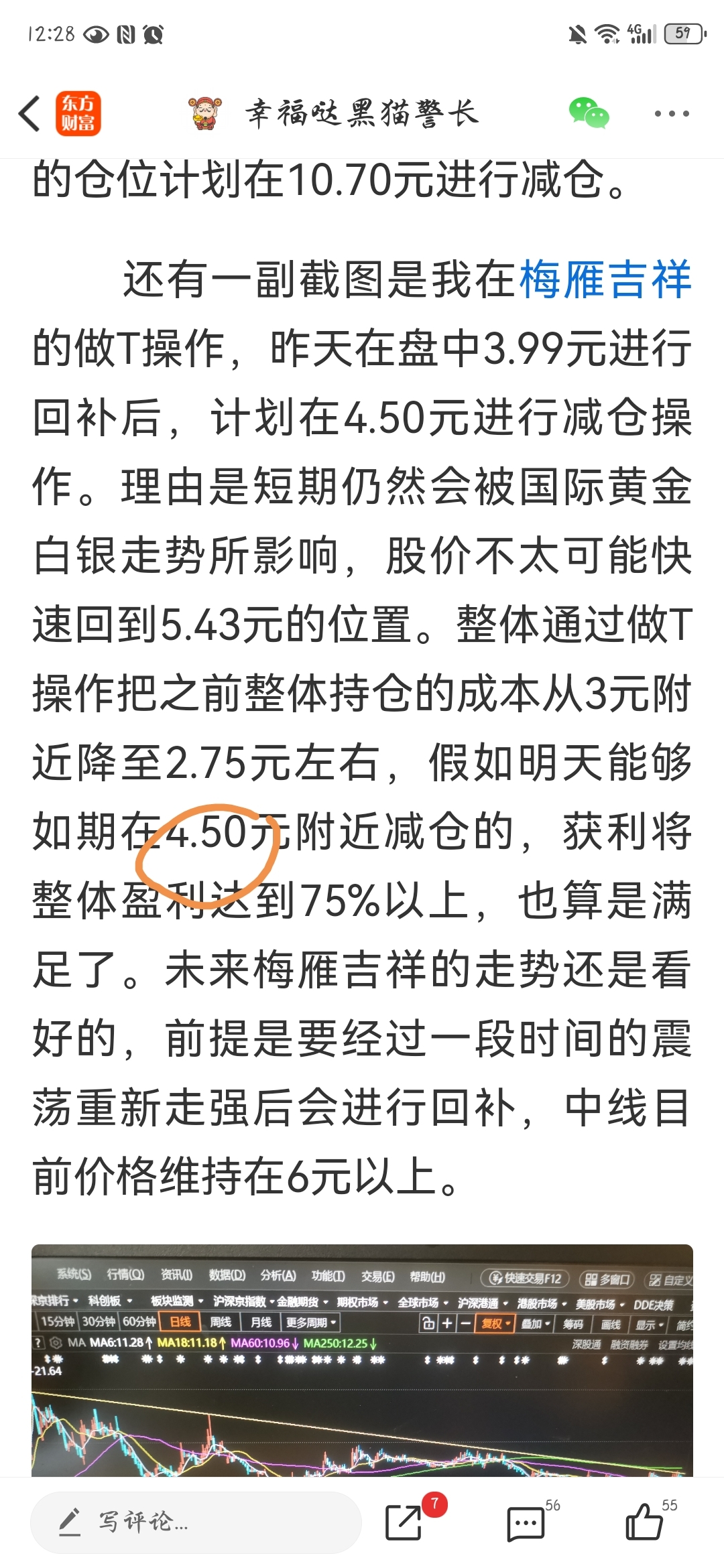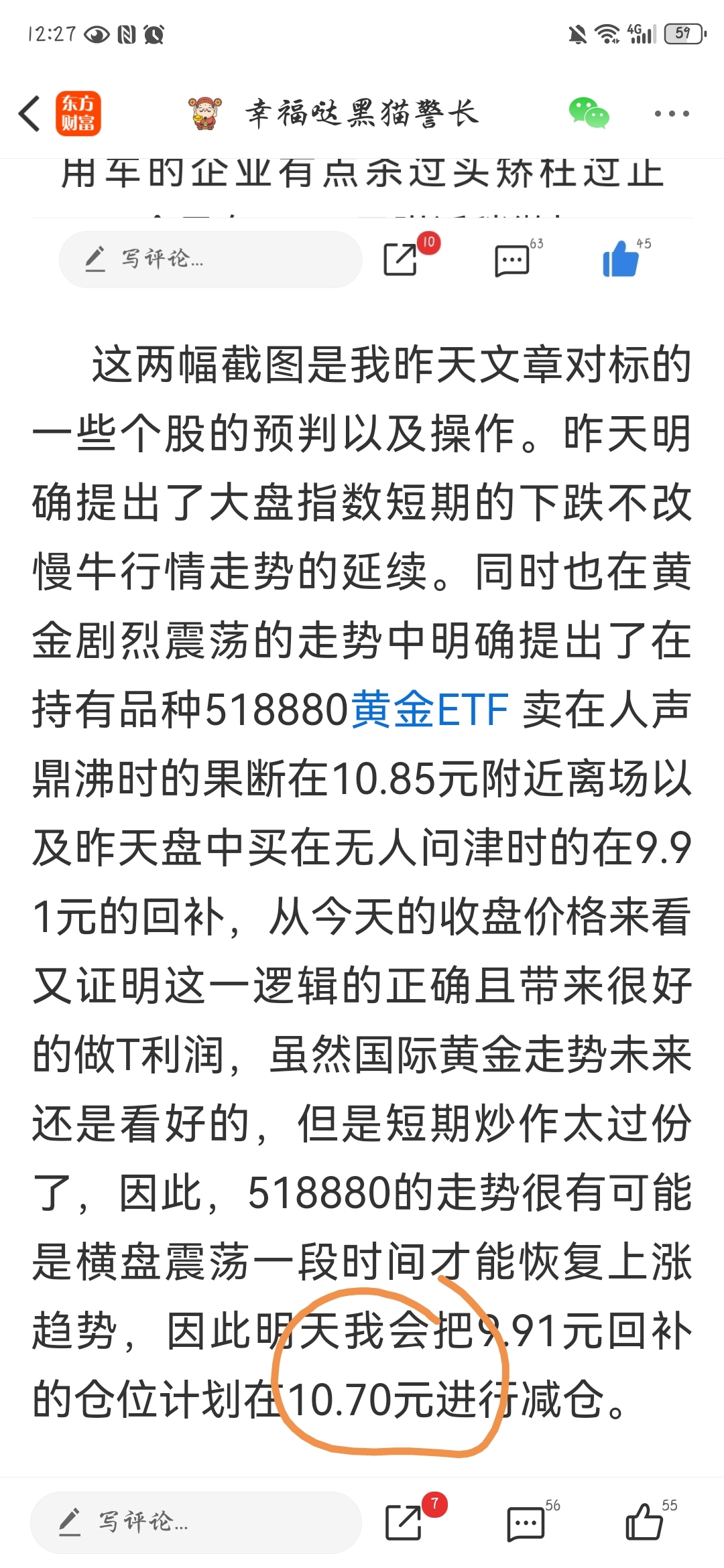 昨天我在帖子里已经分析了大盘指数未来运行趋势的观点以及具体品种操作计划!由于国际黄金大幅下跌后出现了空头回补的反弹走势,但这仅仅是个反弹而已。因此,严格遵守昨天制定的操作计划把9.91元大家都惊慌失措是果断买入回补的仓位于今天10.78元进行了减仓!妥妥的接近9%的价差利润,目前只是持有三成仓位继续观察。暂时没有加仓计划!又如昨天提到的梅雁吉祥,3.99元回补的仓位于今天按计划在4.43元减仓,大概收获了接近10%的盈利。理由是未来国际黄金白银走势大概率会进行到一个横盘震荡区间,因此梅雁吉祥也需要对比较难看的杀跌形态里进行一段时间的修复。虽然我还是看好梅雁吉祥会到达六元的既定目标,但没必要陪同它熬这横盘走势!未来会在技术形态再次走好的情况下进行回补加仓,目前持有三成仓位观察。