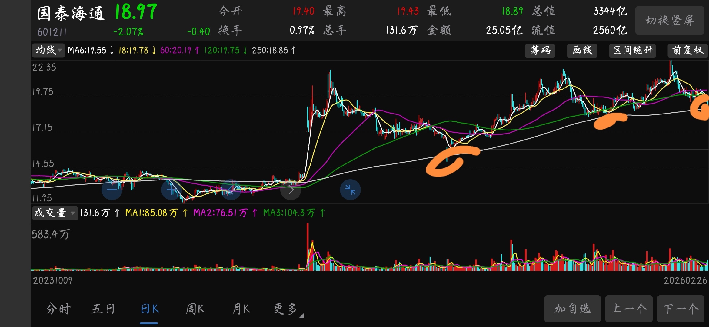 今天我在国泰海通跌至年线附近的位置18.91元进行了加仓操作。很多股友对券商有着众多怨言,为什么我还不止一次的进行加仓操作呢!甚至于还提出可以无脑买入的观点!其实很简单,首选我是自从大盘指数于3000点开始提出了超级慢牛行情开启的观点,至今仍未有任何的改变。每一轮牛市无论是什么形式都会超越上一次的牛市高点,也就是6124点。这次的行情有别于此前疯牛,目前还处于犹犹豫豫缓慢推升的阶段,以时间周期的拉大来完成6124点的超越!因此,大的投资环境没有改变的情况下,券商板块是价值洼地!每一个板块的资金追求都是有轮动的,目前市场资金聚焦在高科技,人工智能等方向,因此券商板块无人问津是很正常的。但作为一名成熟的投资者,目前高科技板块,商业航天板块已经处于一个不是很舒服的有高估存在的一个阶段,我们考虑的是选择人声鼎沸时的急流勇退,转向暂时无人问津时的券商板块。退一万步来说,即使是牛市结束了,目前的券商板块对应的大盘指数在3200点附近,与目前的4200点附近明显是不合理的,何况我们判断的是大盘指数还要向更高的位置进发。所以,我个人还是非常看好券商板块的。