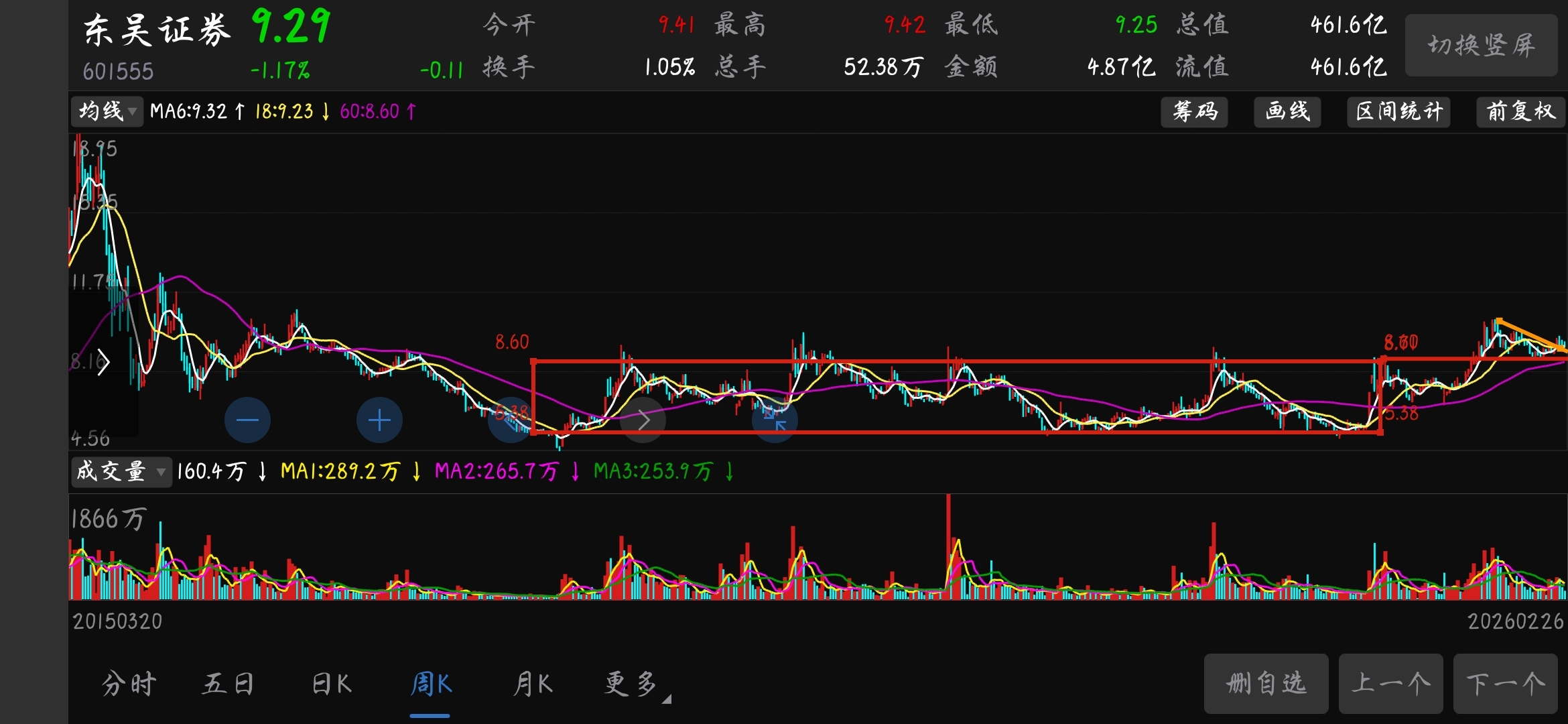 以上两幅图片我分别画出了一些技术图形与关键点位。东吴证券正在处于大型箱体被突破后的下降旗形整理中,随时可以启动,国泰海通已经跌到年线位置了,也是一个很好的加仓位置。所以,券商板块我会一直重仓拿着,绝不轻易放手!我还是维持以上两只个股在目前股价位置上至少有50%涨幅才会考虑是否减仓的观点不变!正如当初我在万向钱潮6.15元买入并超前提出不到12元翻倍以上不去卖出的观点一样的坚定。