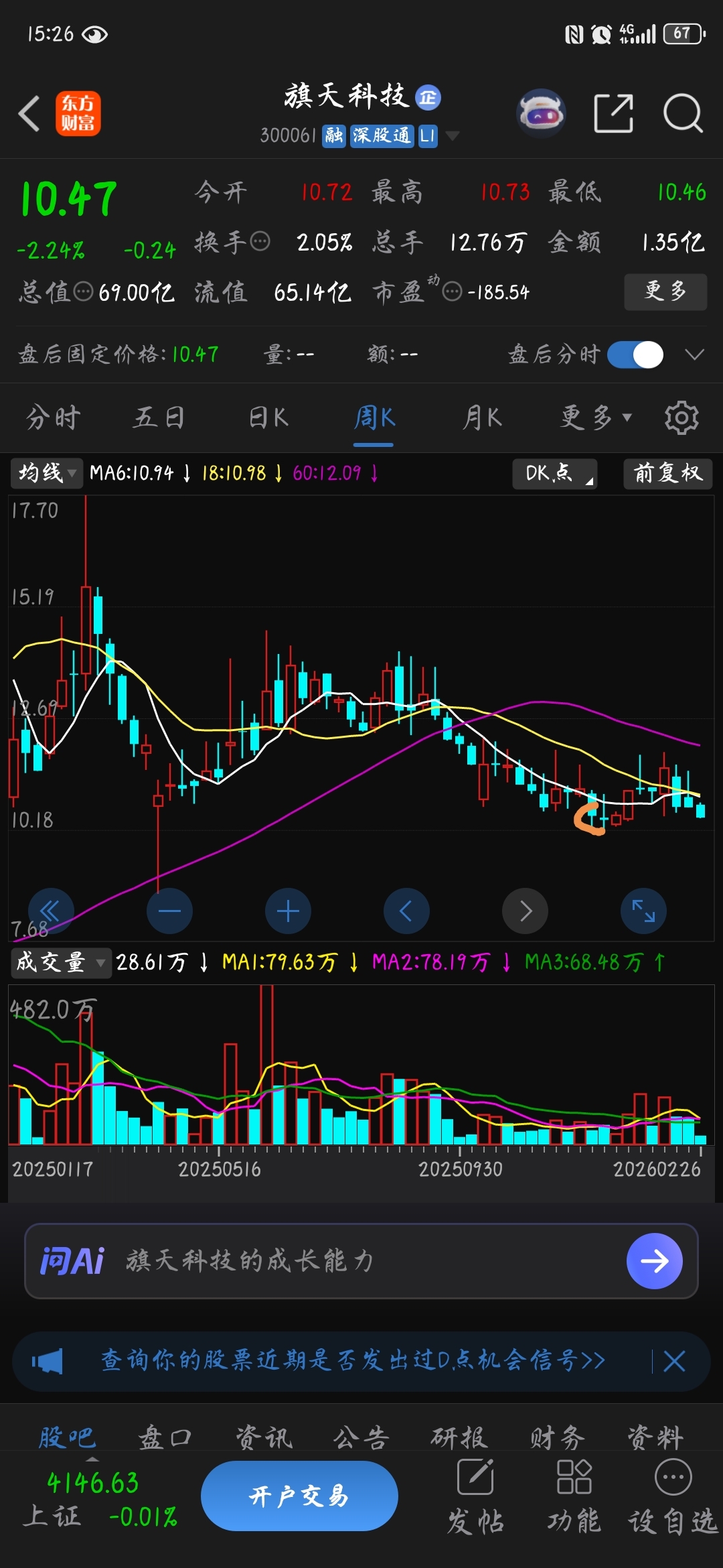 $旗天科技(SZ300061)$ 这两天有点乐不思蜀,还在沉浸在过年的吃喝玩乐中!因此,看盘也有点懒惰了。
